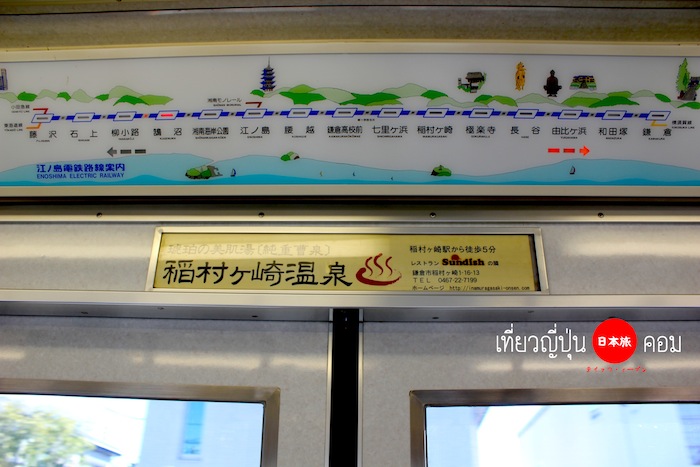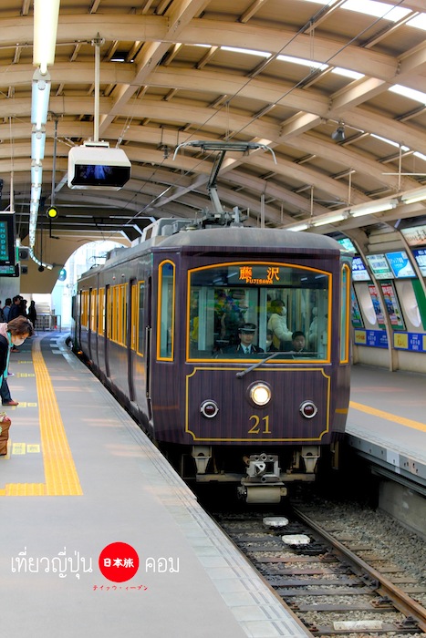 เมื่อถึงสถานี Fujisawa 藤沢駅 แล้วให้เดินออกจากสถานีไปฝั่งตรงข้าม ตามป้ายที่เขียนว่า 江の電のりば (Enoden Noriba) เพื่อขึ้นขบวน ENODEN ต่อ รถไฟวิ่งค่อนข้างถี่เป็นรถไฟโบราณขบวนเล็กๆ รถไฟขาเข้าปลายทางคือ Fujisawa ส่วนรถไฟขาออกที่เราจะขึ้น ปลายทางคือ Kamakura แต่เราจะลงระหว่างทางกันที่สถานี Enoshima