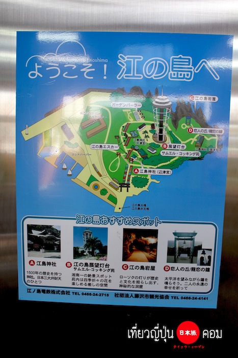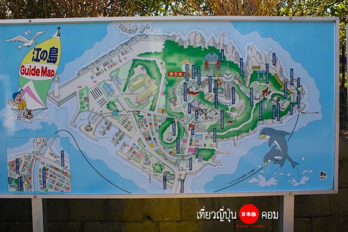 แผนที่ของเกาะ ถ้าเราเดินมาถึงบริเวณหอคอย นั่นคือจุดสูงสุดของเกาะแล้ว (อย่าลืมมองหาระฆังแห่งความรักกันด้วยนะครับ) จากจุดนี้ สามารถเข้าไปชม Aquarium Enoshima-Suizokukan ได้จากจุดนี้ เรียกสั้นๆว่า Enosui ค่าเข้า 2,000 เยน