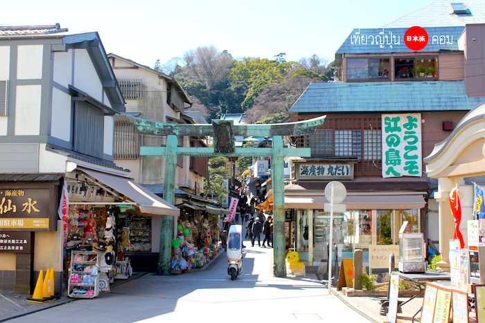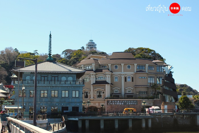 เดินชมวิวมาเรื่อยๆ สักพักก็ถึงเกาะแล้ว ค่อนข้างเจริญทีเดียว ที่ทางเข้าต้อนรับพวกเราด้วยชุมชนและร้านค้าเรียงรายตลอดทาง ทางขวามือที่เห็นจะเป็นสปาชื่อดังของที่นี่ Enoshima Island Spa ใครที่อยากจะแช่น้ำพุร้อนธรรมชาติก็สามารถใช้บริการที่นี่ได้ มีทั้งโซนแก้ผ้าหมดเลยและโซนที่ใส่ชุดว่ายน้ำได้ (สำหรับคนขี้อายหรือไปกับครอบครับกลุ่มใหญ่นะครับ)