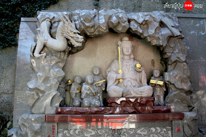 ทางเดินขึ้นสู่ศาลเจ้า เป็นบันไดให้เราไต่เขาขึ้นไปเรื่อยๆ อย่าลืมแวะล้างมือ บ้วนปาก ชำระกายใจให้บริสุทธิ์ก่อนเข้าไปด้านใน และภาพด้านล่างที่เห็น คือท่านเบนเทน ที่ชาวเมืองเคารพและบูชานั่นเองครับ