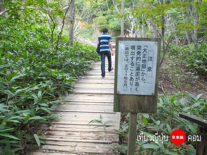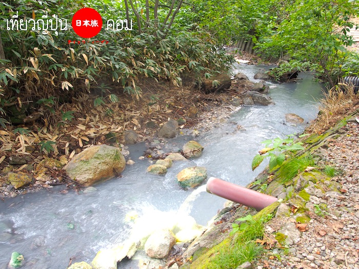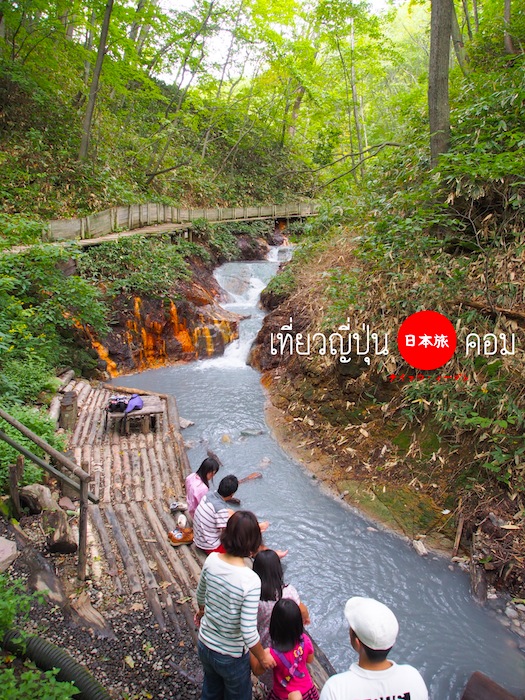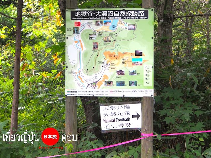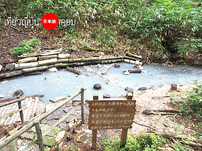 ต้องเดินมาสักพัก จะเจอจุดที่เราสามารถเดินลงไปเพื่อแช่เท้าได้ ป้ายแจ้งว่า ลำธารนี้ไหลมาจากเขา Oyunuma อุณหภูมิของน้ำอาจเพิ่มสูงขึ้นตามฤดูกาลและสภาพอากาศ ให้ระวังตัวด้วย