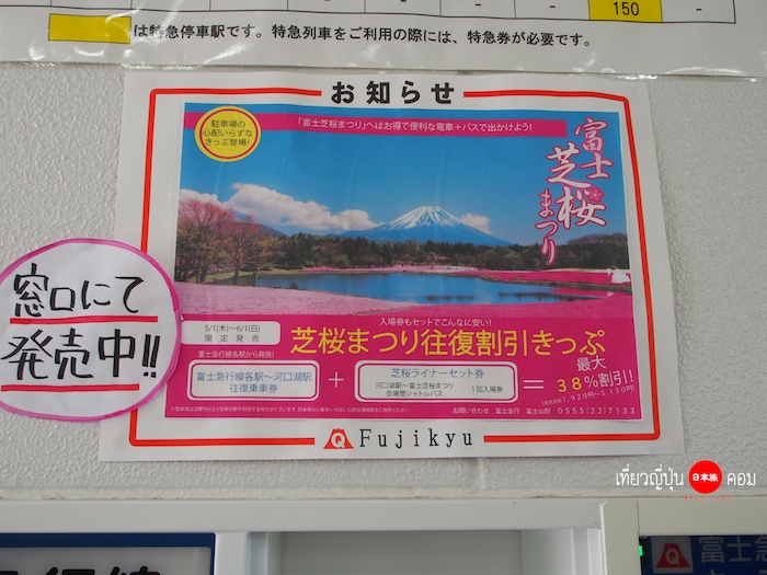 สำหรับการเดินทางในวันนี้ ตอนแรกตั้งใจว่าจะขึ้นขบวน Holiday Rapid แต่เนื่องจากที่นั่งเต็มเลยต้องใช้วิธีที่ 1 โดยนั่งรถไฟมาเปลี่ยนขบวนที่สถานี Otsuki แทน ดังนั้นเพื่อไม่ต้องเสียค่ารถไฟและรถบัสแยกหลายต่อ แนะนำให้ซื้อตั๋ว Shibazakura Festival Round trip ticket โดยจะรวมค่ารถไฟไปกลับ Otsuki<=>Kawaguchiko ค่ารถบัส Shibazakura Line จาก Kawaguchiko ไปทุ่งพิงค์มอส และค่าเข้าชมไว้หมดแล้ว ราคา 3,150 เยน