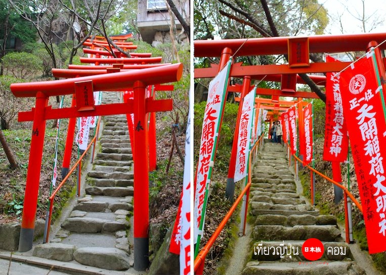 หากเดินมาอีกหน่อยจะพบกับทางขึ้นไปศาลเจ้าหลังเล็ก จะสังเกตุเห็นเสาโทริอิเล็กๆเรียงกันเป็นแถวตามทางขึ้น