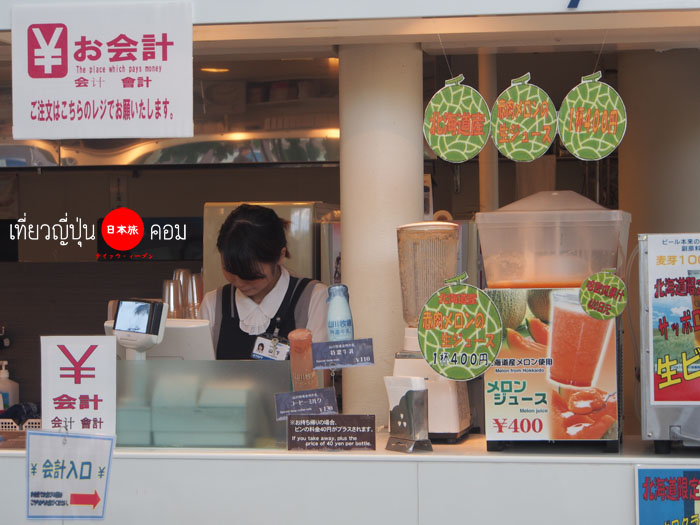 เมลอนที่ฮอกไกโดจะมีสีสดรสชาติหอมหวานกว่าที่ไหนในญี่ปุ่น ถึงขนาดคั้นน้ำออกมาสดๆก็ยังได้รสชาติหวานธรรมชาติ แบบไม่ต้องแต่งเติมอะไร โดยเฉพาะที่ฮาโกดาเตะ ถ้าเดินตามตลาดเช้า จะเห็นแม่ค้าที่ขายผลไม้ คั้นน้ำเมลอนขายสดๆคู่กันไปด้วย และที่ชั้นล่างของ Goryokaku Tower ก็มีขายเช่นกัน Melon Juice ราคาแก้วละ 400 เยน แพงกว่าข้างนอกหน่อย แต่ก็ได้แก้วใหญ่กว่า หอม หวาน เย็น ชื่นใจ ไปลองกันได้ครับ