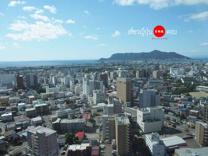 จาก Observation Deck สามารถมองเห็น ป้อม Goryokaku, ช่องแคบ Tsugaru, ภูเขา Hakodate