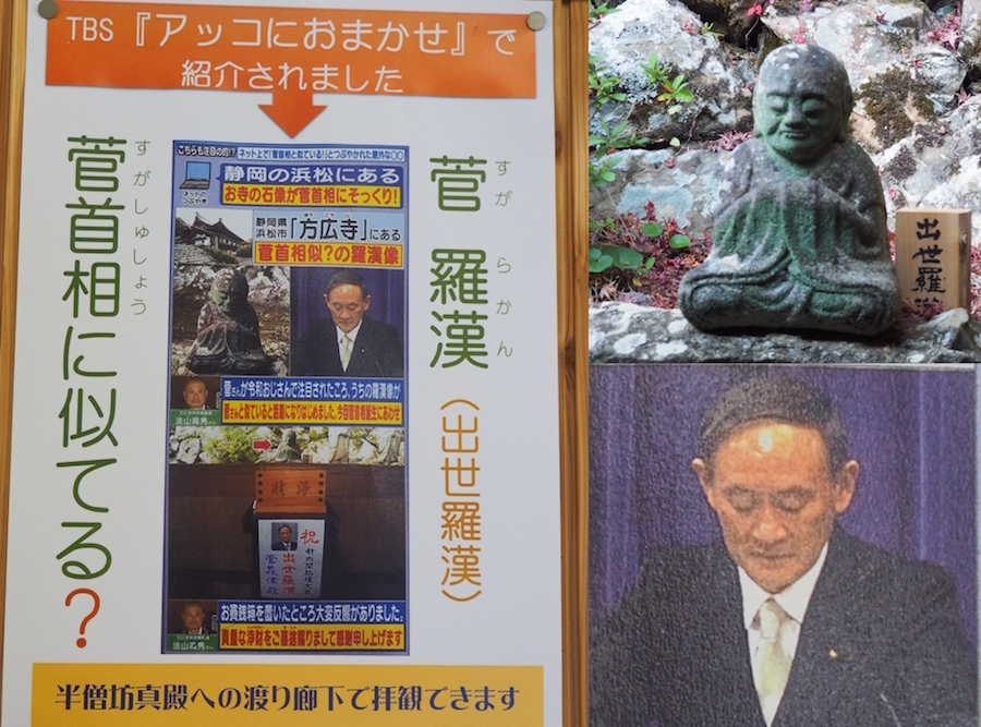 ไฮไลต์ที่เป็นที่ฮือฮาของวัดนี้ก็คือ มีพระพุทธรูป Rakan อยู่องค์หนึ่งที่ชาวญี่ปุ่นบอกว่าหน้าเหมือนคุณ Yoshihide Suga นายกรัฐมนตรีของประเทศญี่ปุ่น ดูรูปแล้วคิดว่าเหมือนไหมคะ