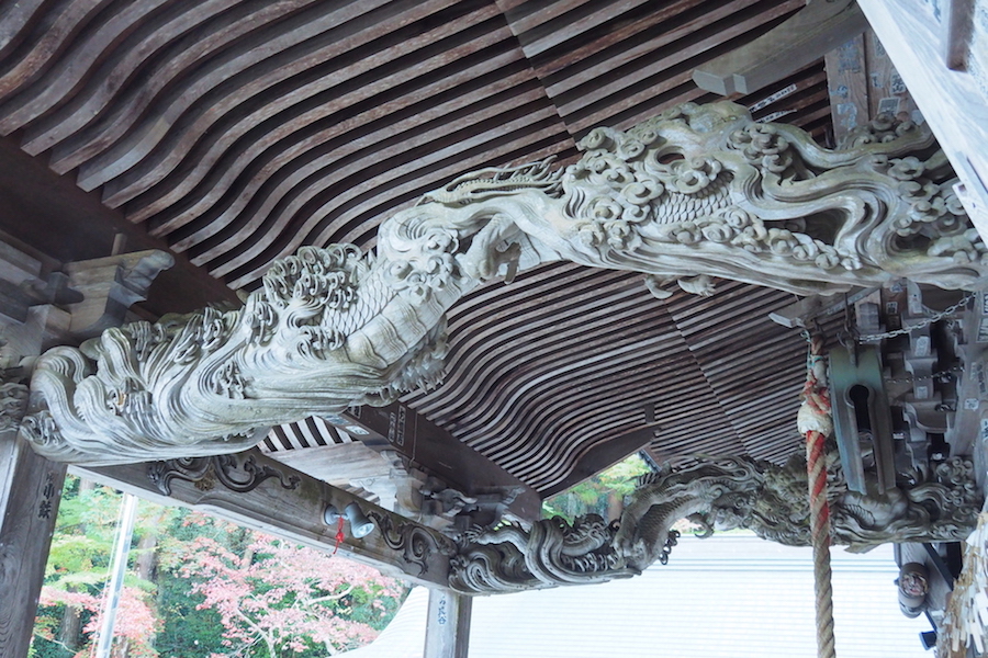 ด้านหน้าของอาคารนี้มีจุดเด่นคือ เสาไม้ที่แกะสลักเป็นรูปมังกร สุดอลังการ เพราะใช้ไม้คุซึท่อนเดียว และมีอายุเกิน 100 ปี