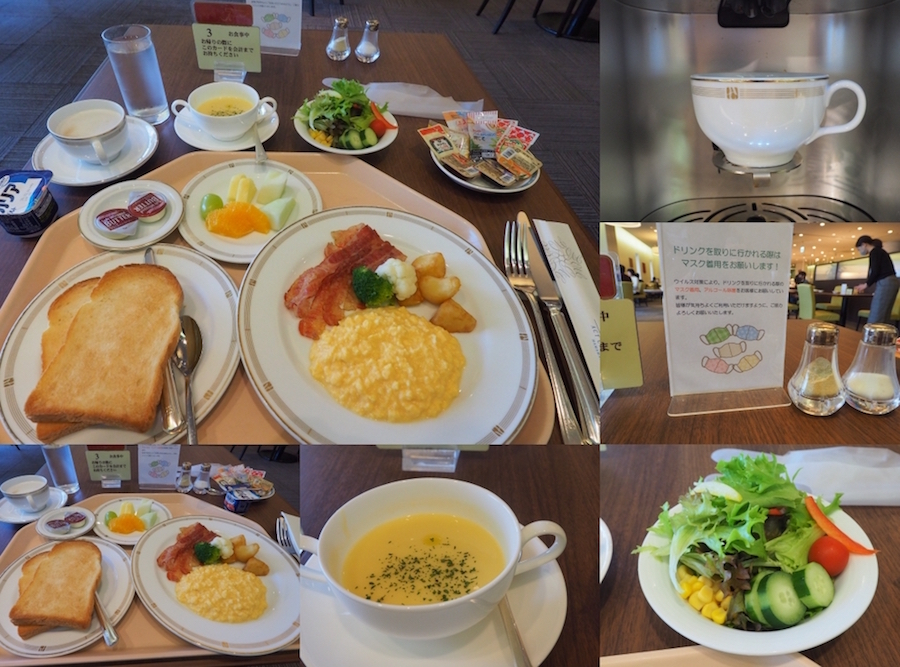 มารีวิวอาหารเช้ากันบ้าง ทางโรงแรมจะจัดมาเป็นแบบเซ็ต ให้เลือกว่าจะเป็นอาหารแบบตะวันตกหรือแบบญี่ปุ่น เพราะช่วงนี้โควิดระบาด ทางโรงแรมเลยจัดเป็นแบบเซ็ตแล้วนำมาเสิร์ฟให้ที่โต๊ะแทนการลุกไปตักเอง ยกเว้นเครื่องดื่มต่างๆ ซึ่งทางโรงแรมก็เตรียมการรับมือเรื่องการแพร่กระจายของไวรัสได้เป็นอย่างดี ตั้งแต่ขั้นตอนการวัดอุณหภูมิ ล้างมือด้วยแอลกอฮอล์ โต๊ะที่นั่งก็จัดให้อยู่ห่างกันเพื่อเว้นระยะห่าง และเราต้องใส่ถุงมือกับหน้ากากอนามัยก่อนลุกไปหยิบเครื่องดื่มด้วยค่ะ