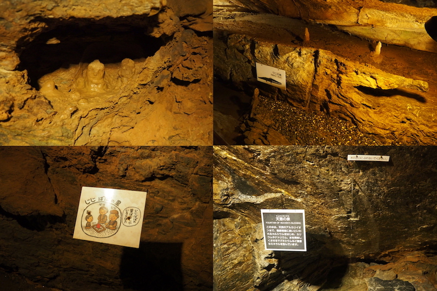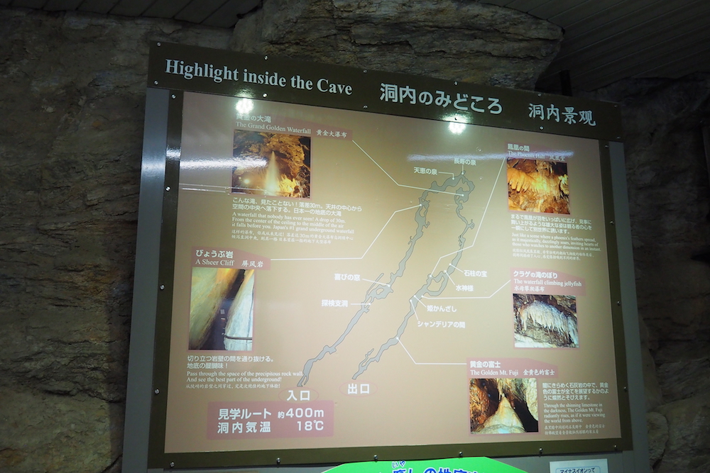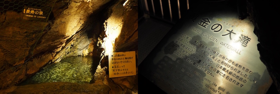 น้ำตกอายุยืน (Fountain of Longevity) น้ำใสมากๆ แต่ไม่สามารถกินได้นะคะ ส่วนไฮไลต์เด่นๆเลยก็คือ น้ำตกสีทอง (The Grand Golden Waterfall) จะเป็นน้ำที่พุ่งลงมาจากผนังหลังคาของถ้ำ ได้ยินเสียงน้ำกระทบกับพื้นแล้วรู้สึกสดชื่นมากๆ น้ำที่ไหลลงมามีความสูงประมาณ 30 เมตร ทำให้นี่เป็นหนึ่งในน้ำตกใต้ดินที่ยาวที่สุดของญี่ปุ่นด้วยค่ะ