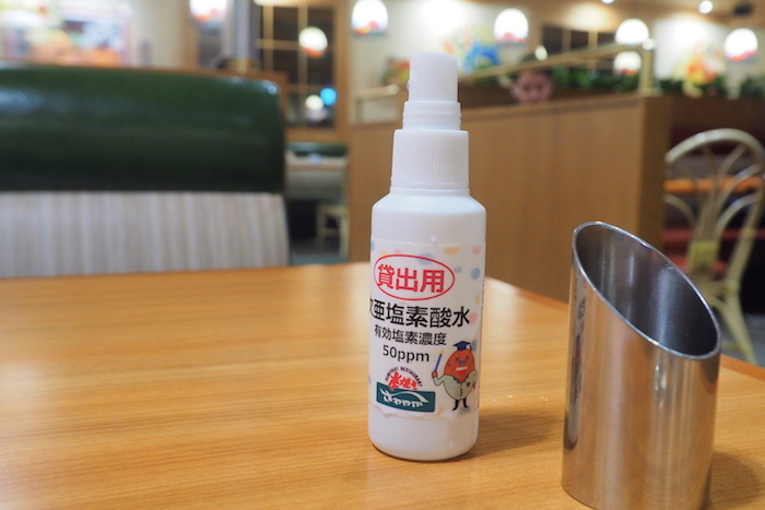ทางร้านมีสเปรย์ฆ่าเชื้อวางไว้ที่โต๊ะ เผื่อว่าใครกังวลเรื่องการหยิบจับขวดเครื่องปรุงต่างๆ