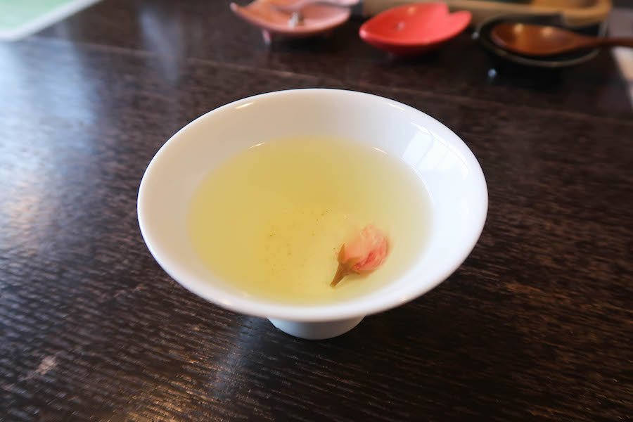 ในตอนท้ายของการเรียน คุณสามารถดื่มชาประจำฤดูกาลปิดท้ายคลาสนี้ อันนี้คือชาซากุระค่ะ มีกลีบซากุระอยู่ด้วย อร่อยและเข้ากับฤดูใบไม้ผลิมาก