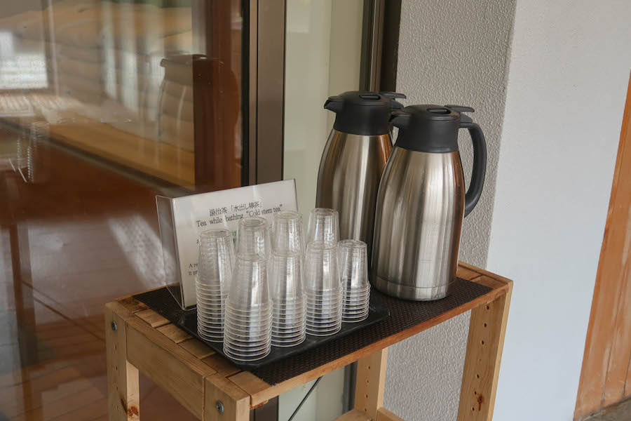 บริเวณทางเข้าออนเซ็นมีชาสำหรับดื่มก่อนแช่ และภายในออนเซ็นยังมีชาสำหรับดื่มระหว่างแช่ด้วย แน่นอนว่ามีแม้กระทั่งชาสำหรับดื่มหลังแช่ ซึ่งจุดดื่มชาแต่ละจุดของที่นี่จะมีการอธิบายไว้ว่าชาชนิดนี้มีสารที่ช่วยในเรื่องใดบ้าง