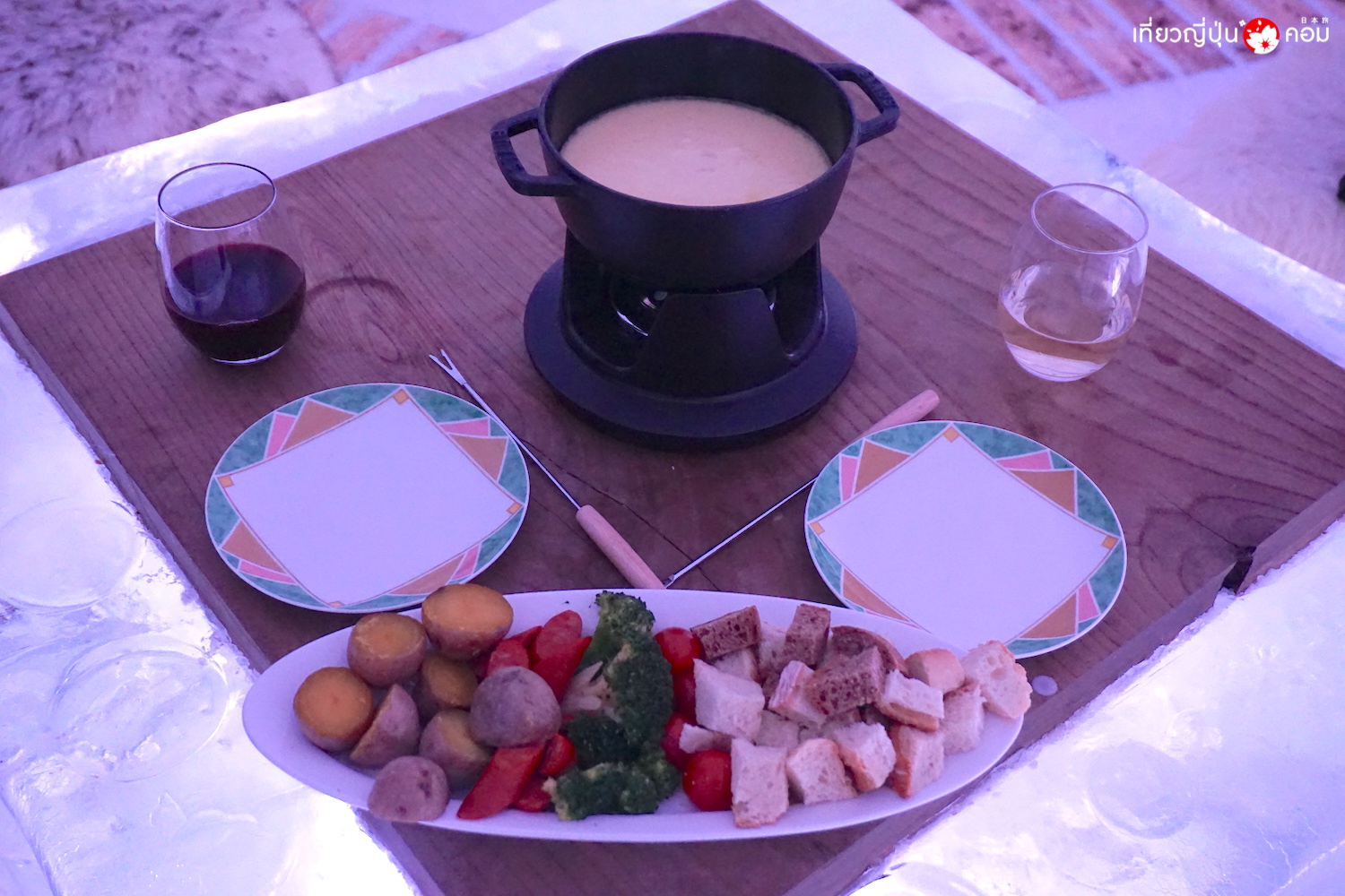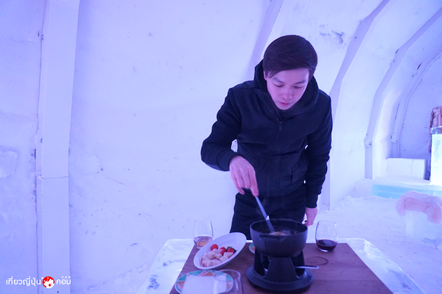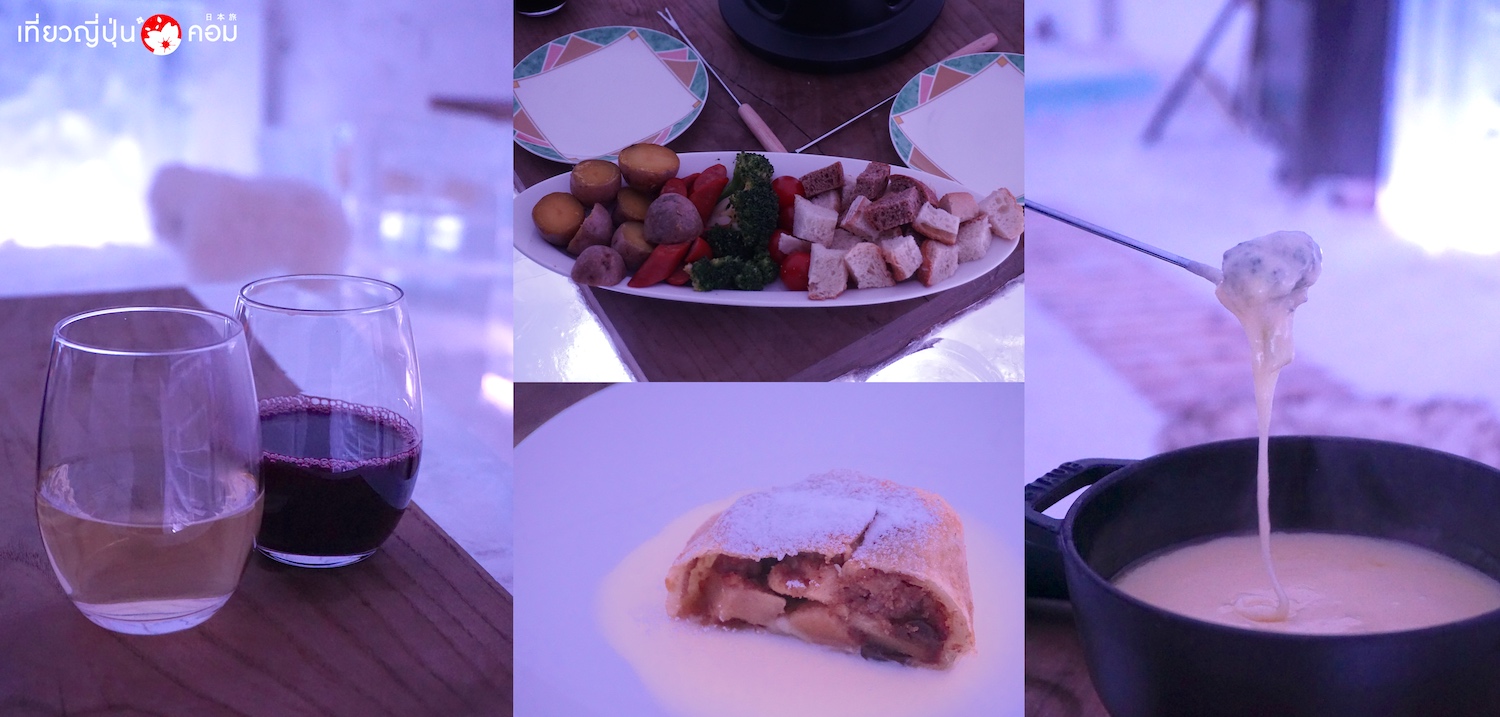 ดินเนอร์หนาวสุดขั้วใน ICE Star Restaurant โดยเสิร์ฟอาหารเป็นคอร์สชีสฟองดู ต้นตำรับจากสวิส เสิร์ฟพร้อม ซุปเห็ด และปิดท้ายด้วย แอปเปิลพายอุ่นๆ สนนราคาคนละ 4,000 เยน + ค่าบริการ 1,000 เยน