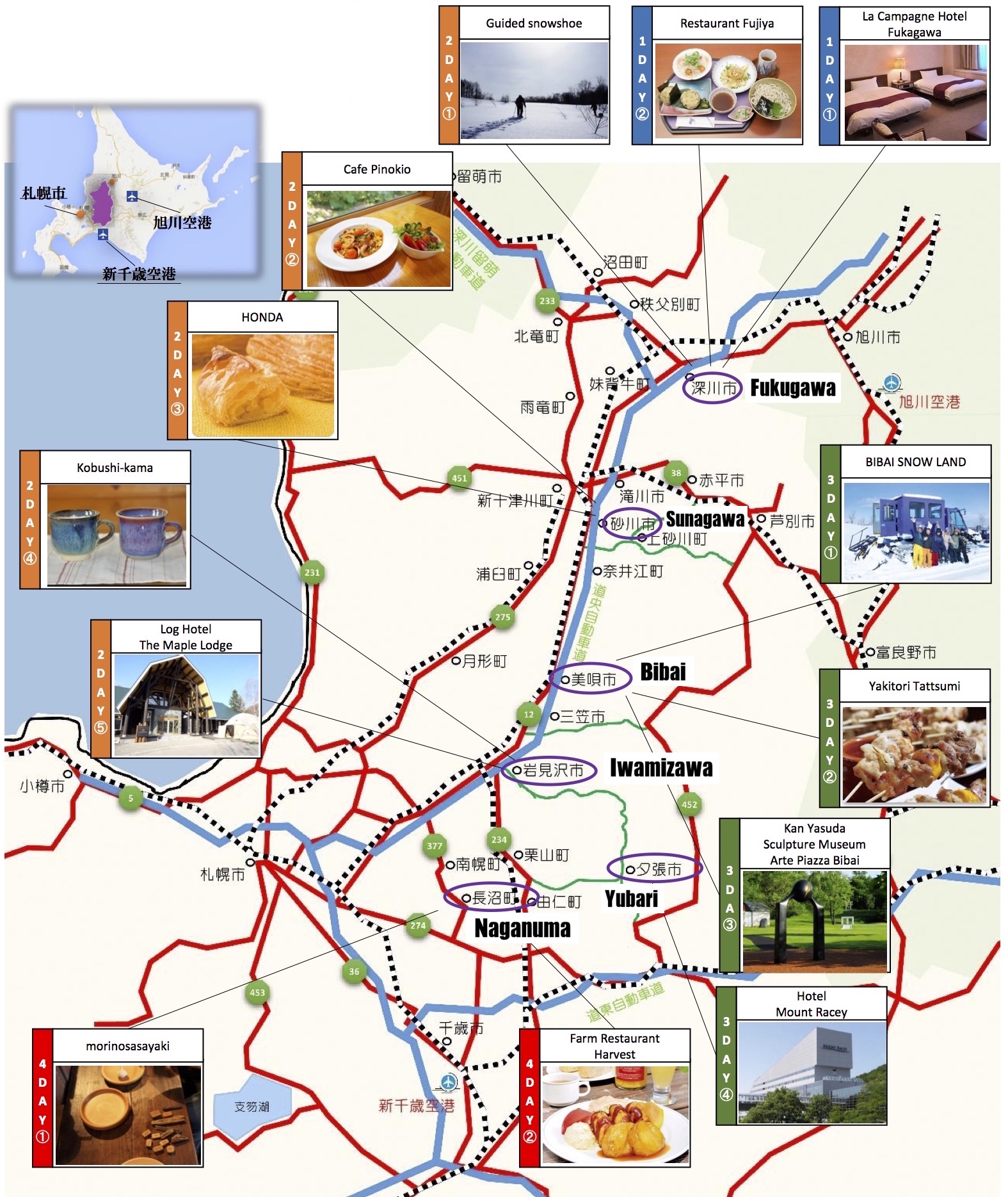 ทริปนี้จะใช้เวลา 4 วัน เก็บรายละเอียดทั้งหมด 6 เมือง คือ เมืองฟุคุกะวะ (Fukugawa) เมืองสุนะกะวะ (Sunagawa) เมืองอิวะมิซะวะ (Iwamizawa) เมืองบิไบ (Bibai) เมืองยูบะริ (Yubari) และ เมืองนะกะนุมะ (Naganuma) สำหรับเส้นทางการเดินทางตลอด 4 วันของทริปนี้ ลองดูจากแผนที่ด้านล่างนี้ได้เลยครับ