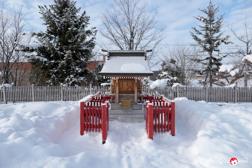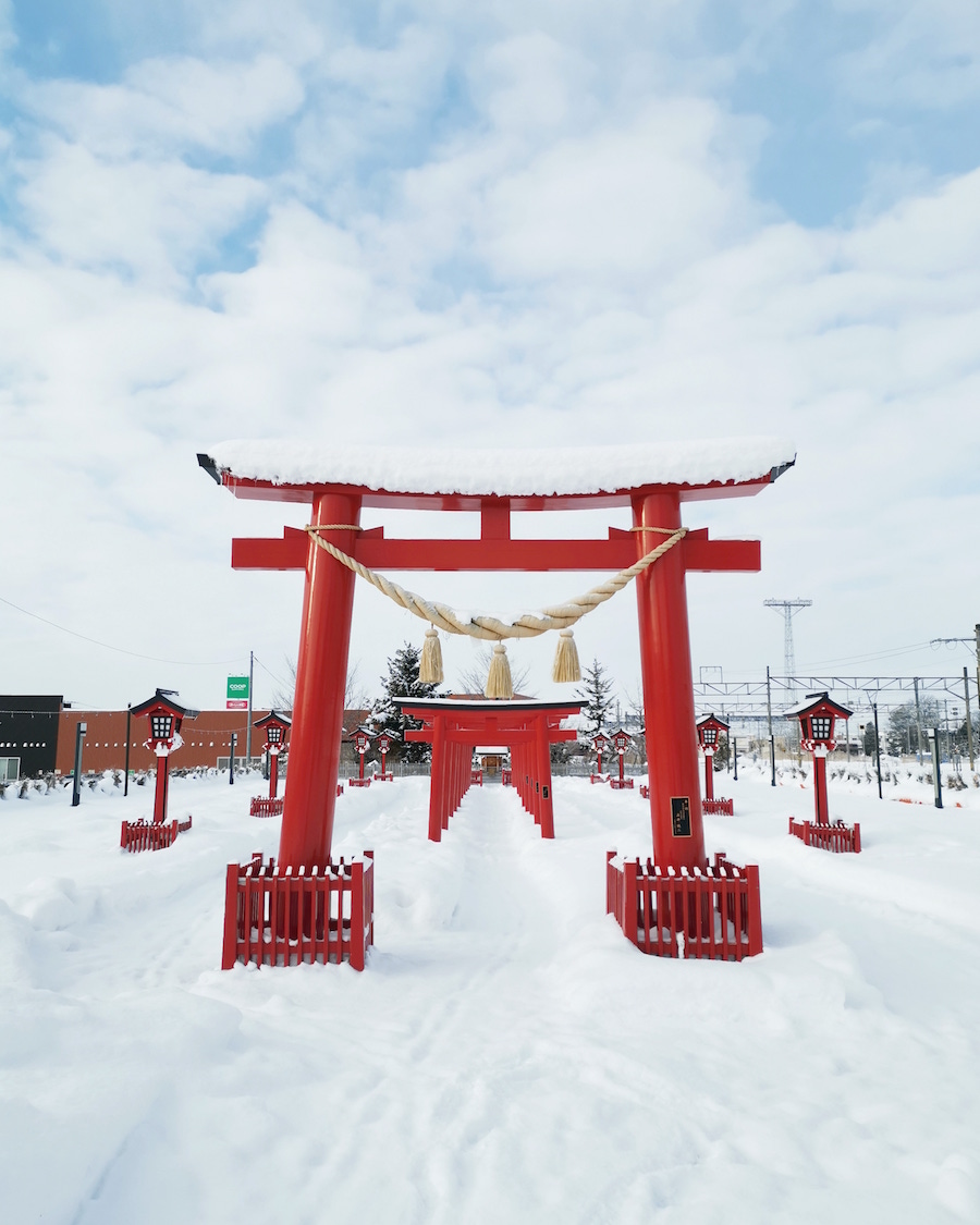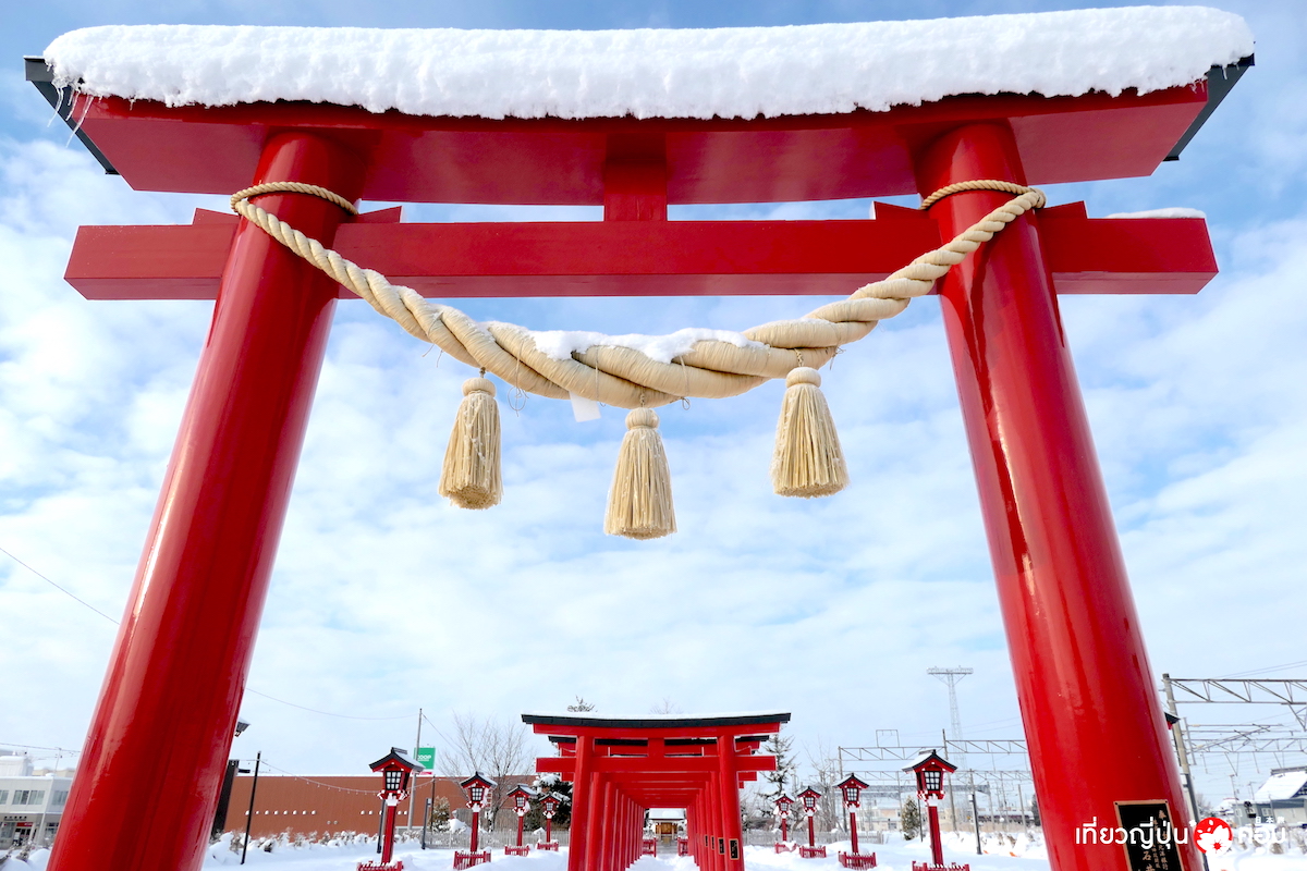 ศาลเจ้าฟุคุโทมิ (Fukutomi Shrine) เสาโทริอิแดงของศาลเจ้า ตัดกับหิมะขาวโพลน ที่ปกคลุมทั่วทั้งสวนสาธารณะฮกคนมิโฮโระ (Hokkon Mihoro Park) ด้านหน้าสถานี JR Fukagawa เป็นมุมถ่ายรูปที่ไม่ควรพลาดเด็ดขาด