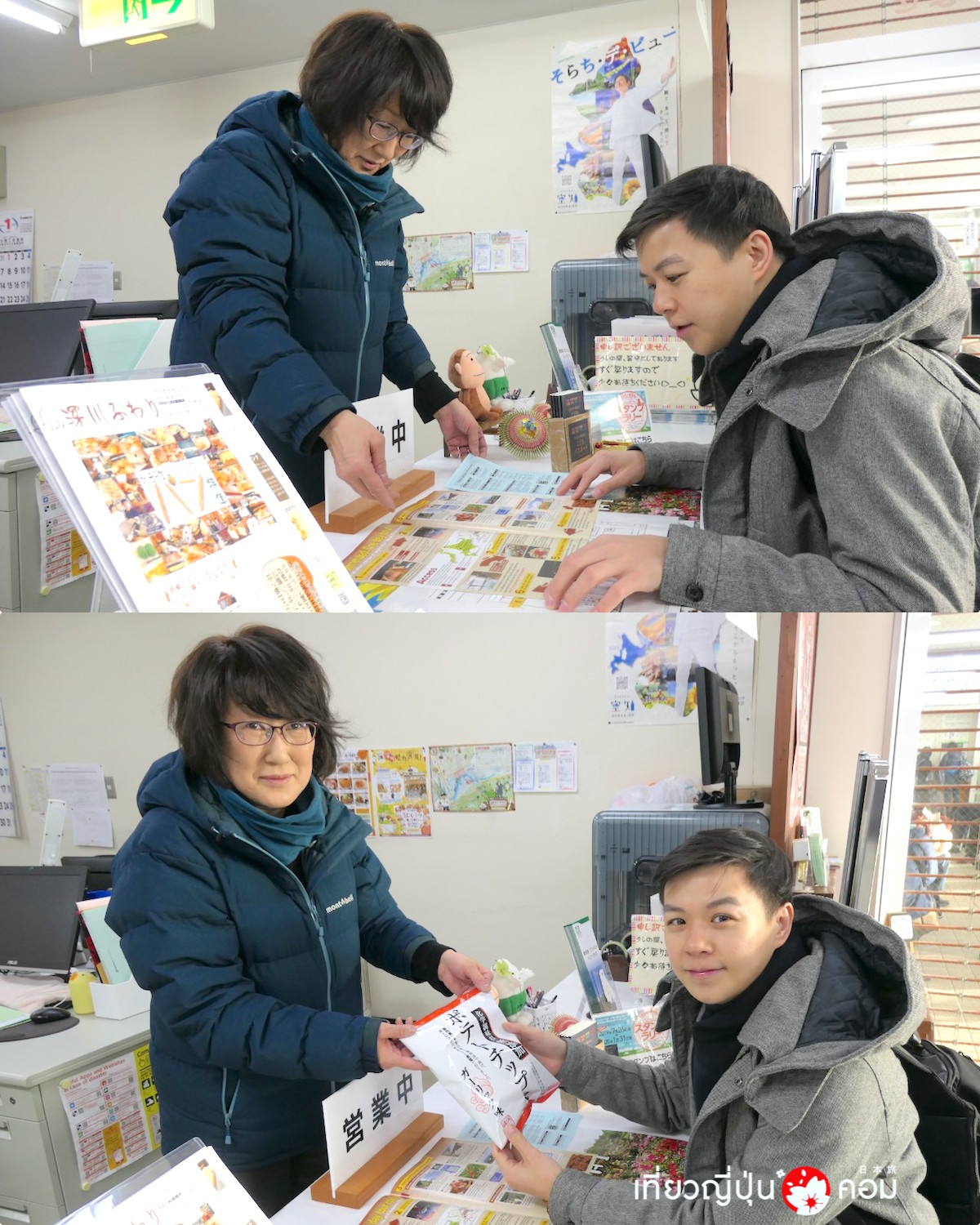 เมื่อมาถึงสถานีแล้ว ให้แวะที่ศูนย์ข้อมูลท่องเที่ยว ปรึกษาเส้นทาง และขอแผนที่พร้อมคำแนะนำเดินเที่ยวในเมืองได้ และอย่าลืมบอกว่า มาที่นี่เพราะอ่านรีวิวของเที่ยวญี่ปุ่นดอทคอม (หรือแสดงรีวิวนี้ให้จนท.ดู) จะได้รับ Potato chips ไร้สารปรุงแต่ง สูตรเฉพาะของเมืองนี้ เป็นของขวัญครับ