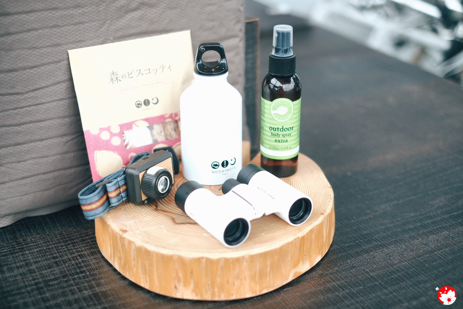 อุปกรณ์สำหรับแกลมปิ้ง ที่อยู่ภายในกระเป๋า ประกอบไปด้วย ไฟฉายคาดหัว, กล้องส่องทางไกล, สเปรย์ไล่แมลง, ขนม Biscotti และ กระติกนํ้า โดย 3 อย่างหลัง สามารถนำกลับบ้านได้เลยครับ