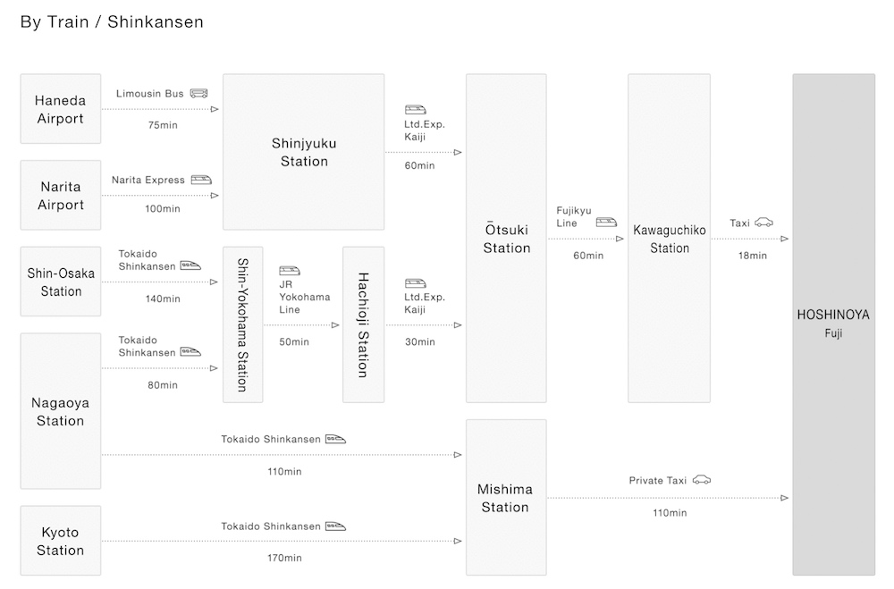 การเดินทางจากโตเกียว: ตั้งต้นที่สถานี Shinjuku ขึ้นรถไฟ JR สาย Chuo ขบวนด่วนพิเศษ Fuji Excursion ลงที่สถานี Kawaguchiko