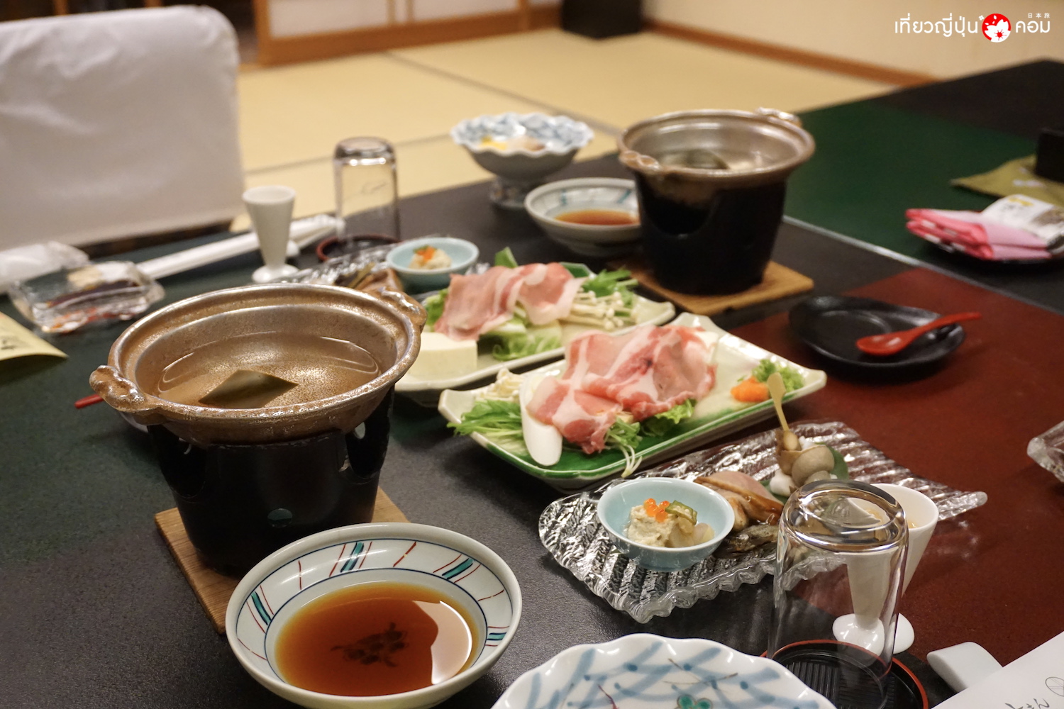 มื้อเย็นเสิร์ฟเป็นคอร์สชาบูเนื้อทะจิมะ ใครไม่ทานเนื้อสามารถเปลี่ยนเป็น หมู หรือ ไก่ได้ แต่ต้องแจ้งล่วงหน้า
