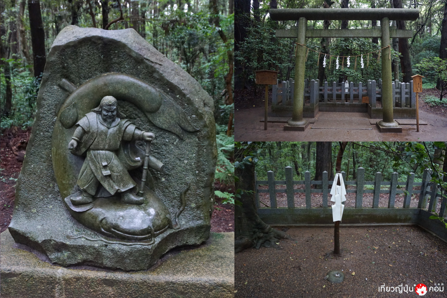 ด้านในมีหินที่มีการสะกดปลาดุกขนาดใหญ่ไว้ใต้พื้นโลก ที่เชื่อกันว่าเป็นต้นเหตุของแผ่นดินไหวตามตำนานญี่ปุ่นโบราณ