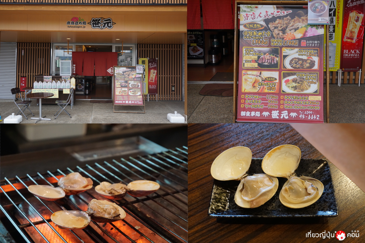 บริเวณด้านหน้าทางเข้าศาลเจ้า มีร้านอาหารในแบบฉบับของคาชิมะให้เลือกทานด้วย ช่วงที่เราไปค่อนข้างเย็นแล้ว แต่ยังมีร้าน Fufu Sasagen เปิดให้บริการ เลยแวะเข้าไปชิมหอยฮามากุริ (Hamaguri) ย่างแบบสดๆ ซึ่งหอยฮามากุริเป็นอาหารขึ้นของคาชิมะ นอกจากนี้ถ้าใครหิวหนักก็ยังมีเมนูเด็ดอย่าง สเต็กเนื้อ และแกงกะหรี่หอยฮามากุริด้วย