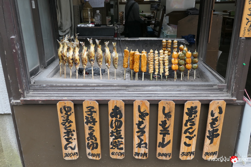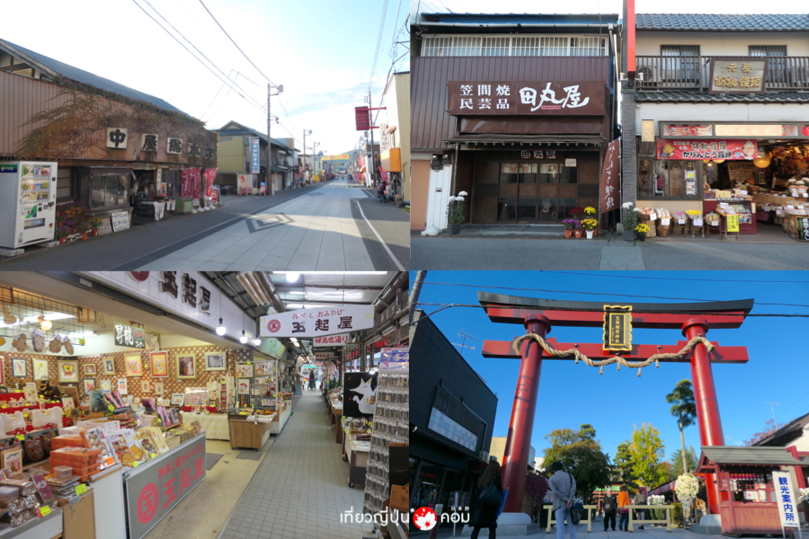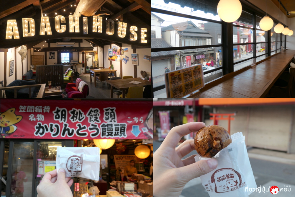 หลังจากเดินชมศาลเจ้ากันเป็นที่เรียบร้อย ข้ามถนนมาฝั่งตรงข้ามกับศาลเจ้า จะพบกับถนน Kasama Inari Monzen Street มีร้านค้าเรียงรายมากมาย กว่า 44 ร้าน และหนึ่งในนั้นร้านขายขนมอร่อยเจ้าดัง ลักษณะคล้ายกับมันจูเคลือบด้วยน้ำตาลแดงสีเข้มข้น กรอบนอกนุ่มใน ด้านในเป็นไส้ถั่วแดงและผลวอลนัทลูกโต