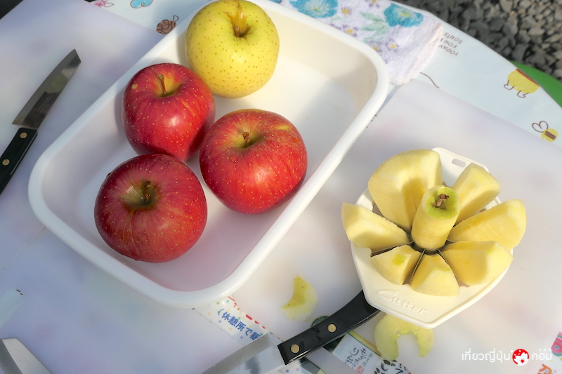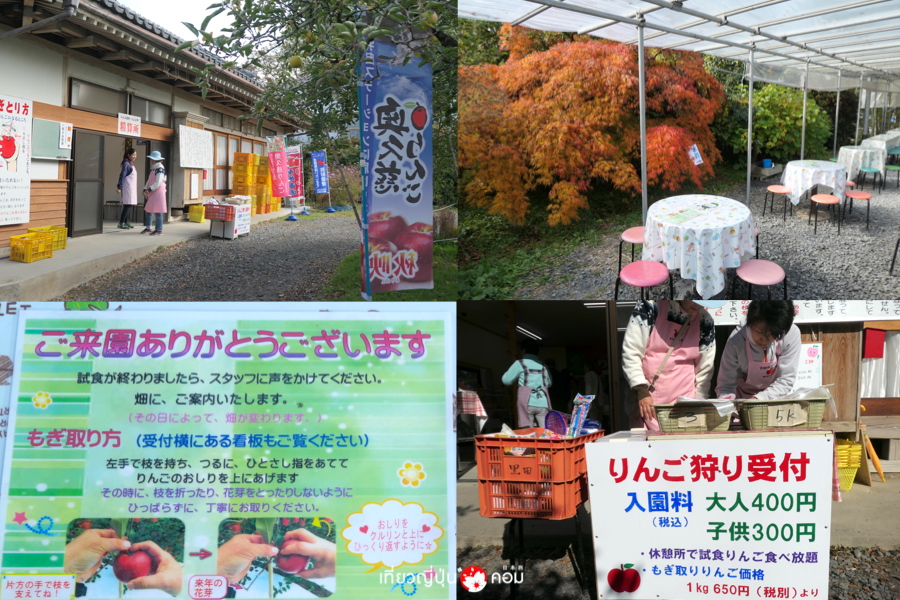 - ค่าใช้จ่าย: ค่าเข้าสวน ผู้ใหญ่ 400 เยน เด็ก 300 เยน / คิดราคาแอ๊ปเปิ้ลที่เก็บเอง 650 เยน/ 1 กก