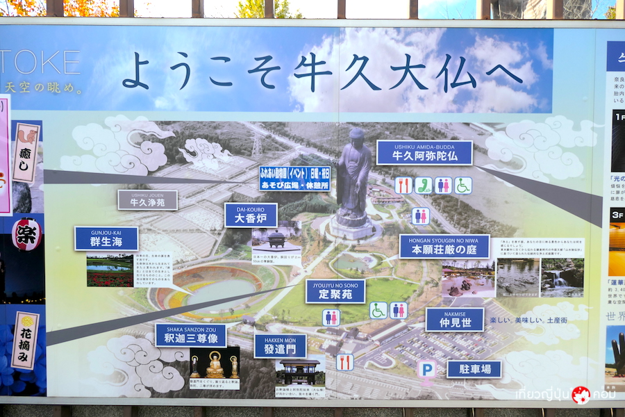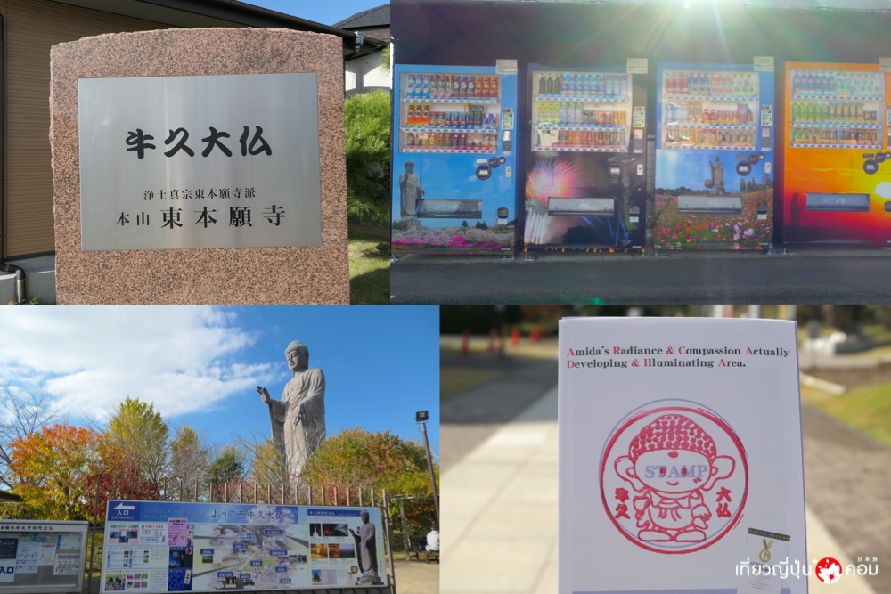 - วิธีการเดินทาง: ขึ้นรถไฟ JR สาย Joban ลงสถานี Ushiku โดยสารรถบัสประจำทางตรงประตูทิศวันตะวันออก จุดขึ้นรถบัสหมายเลข 2 ที่วิ่งตรงไป Ushiku-daibutsu / Ushiku-joen หรือรถบัสประจำทางที่วิ่งไปยัง Ami Premium Outlets ลงที่ป้ายรถประจำทาง Ushiku-daibutsu ใช้เวลาประมาณ 30 นาที ราคา 680 เยน