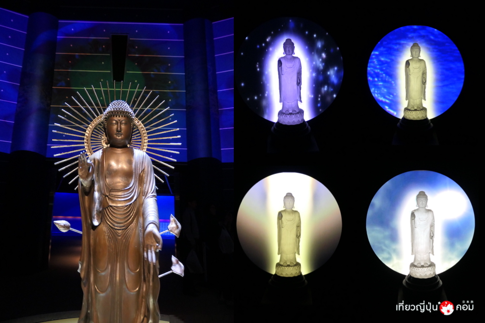 เมื่อเข้ามาด้านในขององค์พระพุทธรูป จะมีการดับไฟให้ทำสมาธิเป็นเวลาประมาณ 1 นาที โดยเจ้าหน้าที่ก็จะอธิบายเกี่ยวกับกุศโลบายของปัญหา เปรียบเทียบปัญหาได้กับความมืด แต่ถ้าเรามีสติและปัญญาก็จะมาสามารถแก้ปัญหาได้จนลุล่วง เปรียบเสมือนแสงสว่างขององค์พระพุทธนั่นเอง เมื่อเปิดไฟขึ้นจะพบว่าบริเวณตรงกลางขององค์พระจะเป็นที่ตั้งของพระพุทธรูปองค์ประธาน