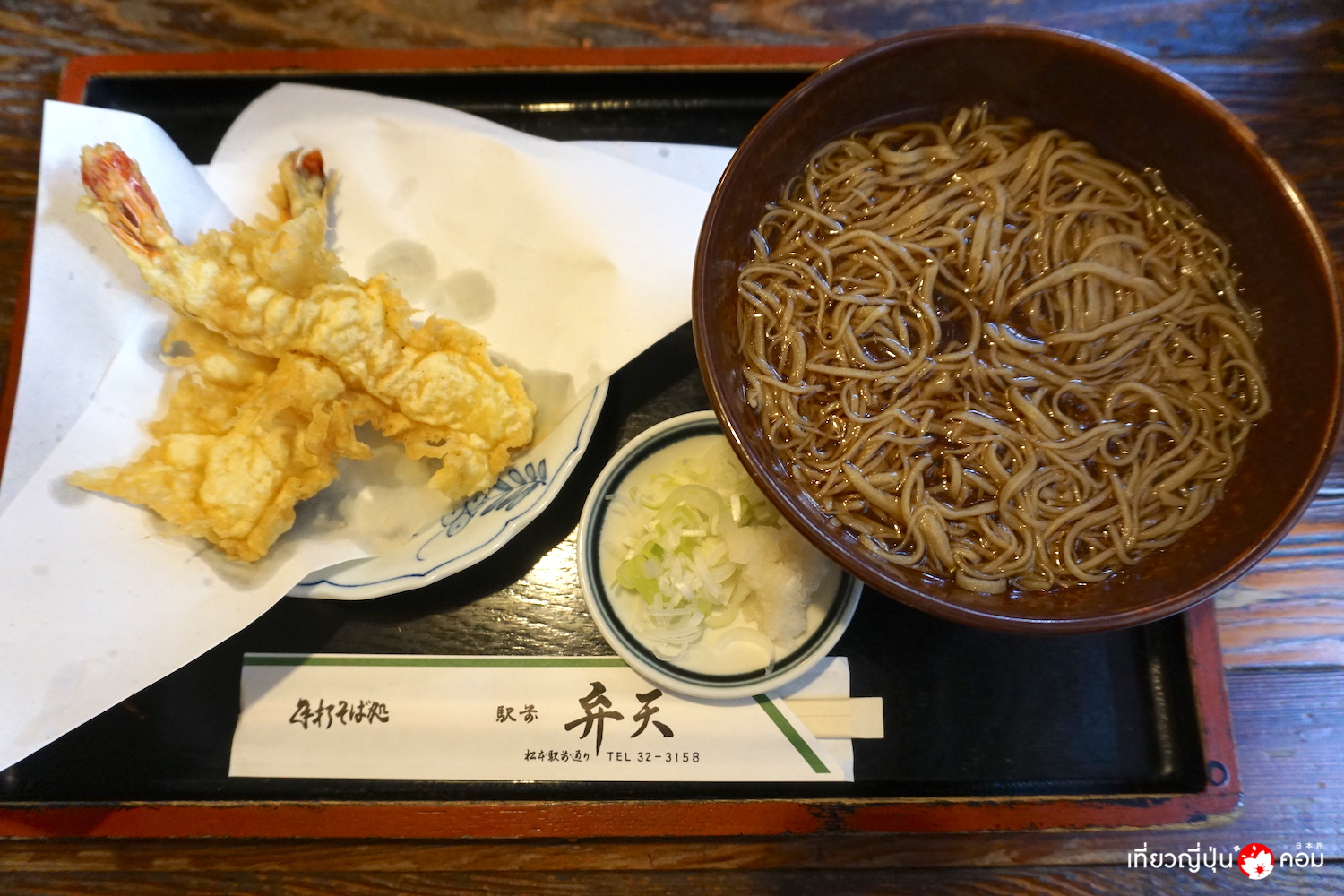 ก่อนที่จะเดินทางไกลกันต่อ เราแวะมาทานมื้อเที่ยงกันที่ร้าน Benten ตั้งอยู่บนถนนหน้าสถานี Matsumoto ร้านนี้เปิดมาแล้ว 120 ปี ต้องชิมโทจิโซบะ (Toji soba) เมนูดังของมัตสุโมโตะ ส่วนใหญ่โซบะจะกินกันแบบเย็นๆ แต่โทจิโซบะจะกินโดยเอาเส้นใส่ในตระกร้อ จิ้มจุ่มในหม้อร้อนก่อนทาน ชุดนึงทานได้ 2 คน ราคา 1,700 ต่อคน