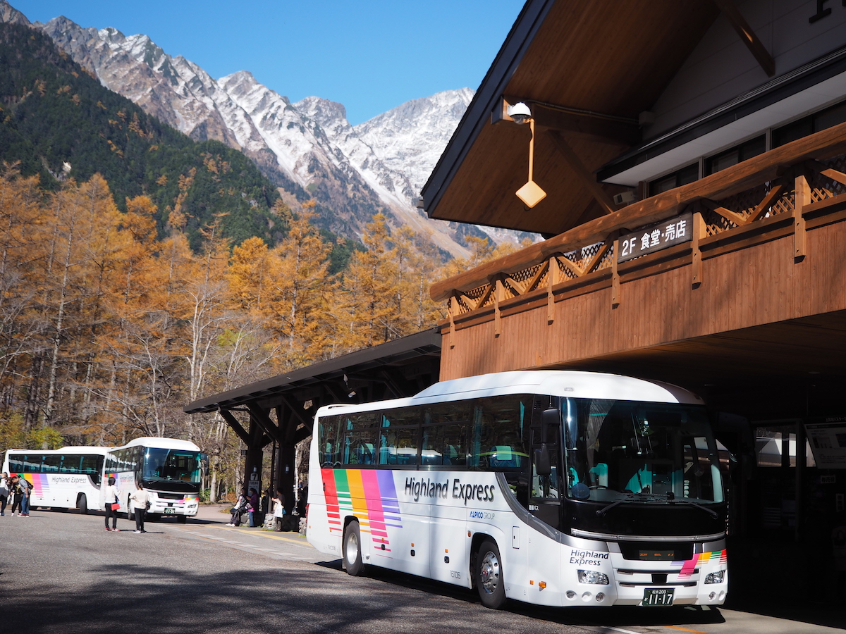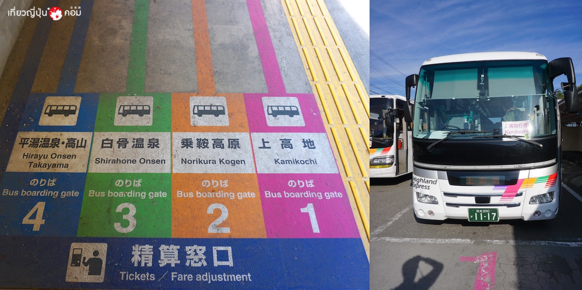จาก สถานี Shin-Shimashima จะเป็นท่ารถบัสที่สามารถเดินทางต่อไปได้หลายจุดหมาย แค่มองสีที่ทางเดินก็จะทราบว่าเราต้องไปขึ้นรถบัสที่ป้ายหมายเลขอะไร เพื่อไปจุดหมายที่ต้องการได้อย่างง่ายดาย อย่างจุดหมายของเราในวันนี้คือ Kamikochi สายสีชมพู ให้ไปขึ้นที่ป้ายรถบัสหมายเลข 1