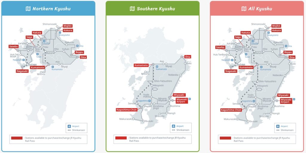 JR Kyushu Rail Pass มี 3 ประเภทแบ่งเป็น All Kyushu Area / Northern Kyushu Area / Southern Kyushu Area ดูรายละเอียดที่นี่ >> JR KYUSHU RAIL PASS