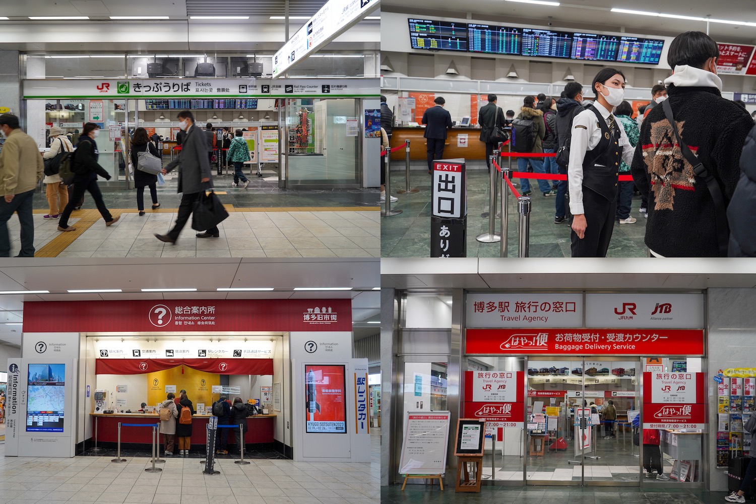เริ่มต้นทริปจากสถานี Hakata มีศูนย์บริการนักท่องเที่ยว และเคาน์เตอร์เจอาร์เราสามารถแลกพาสรถไฟได้ที่นี่ แนะนำให้มาเปิดพาสก่อนแล้วค่อยเดินทางในวันต่อไปเนื่องจากมีนักท่องเที่ยวมาแลกพาสเป็นจำนวนมาก ทำให้แถวค่อนข้างยาว ภายในห้องออกตั๋วมีพนักงานเจอาร์คอยให้ข้อมูล และอำนวยความสะดวกให้กับนักท่องเที่ยว นอกจากนี้ยังมีบริการใหม่จากเจอาร์ส่งกระเป๋าไปยังปลายทางด้วยรถไฟชินคังเซ็นด้วย