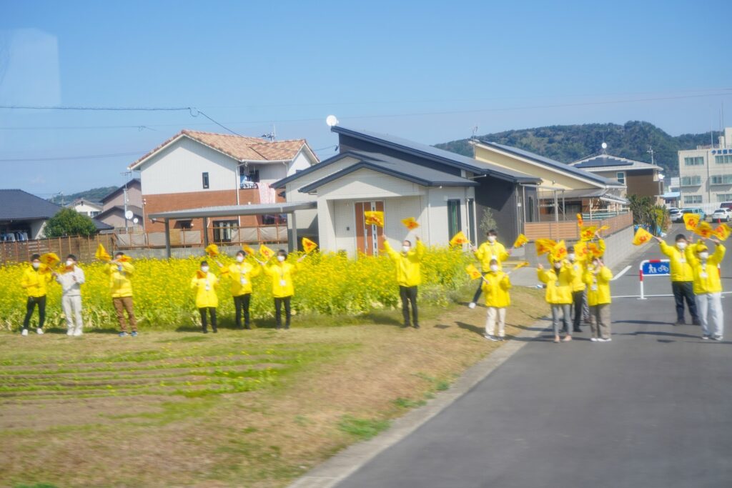 เมื่อใกล้ถึงสถานีอิบุสึกิจะเจอคนในท้องถิ่นออกมาต้อนรับ และโบกมือทักทายด้วย น่ารักมากๆ