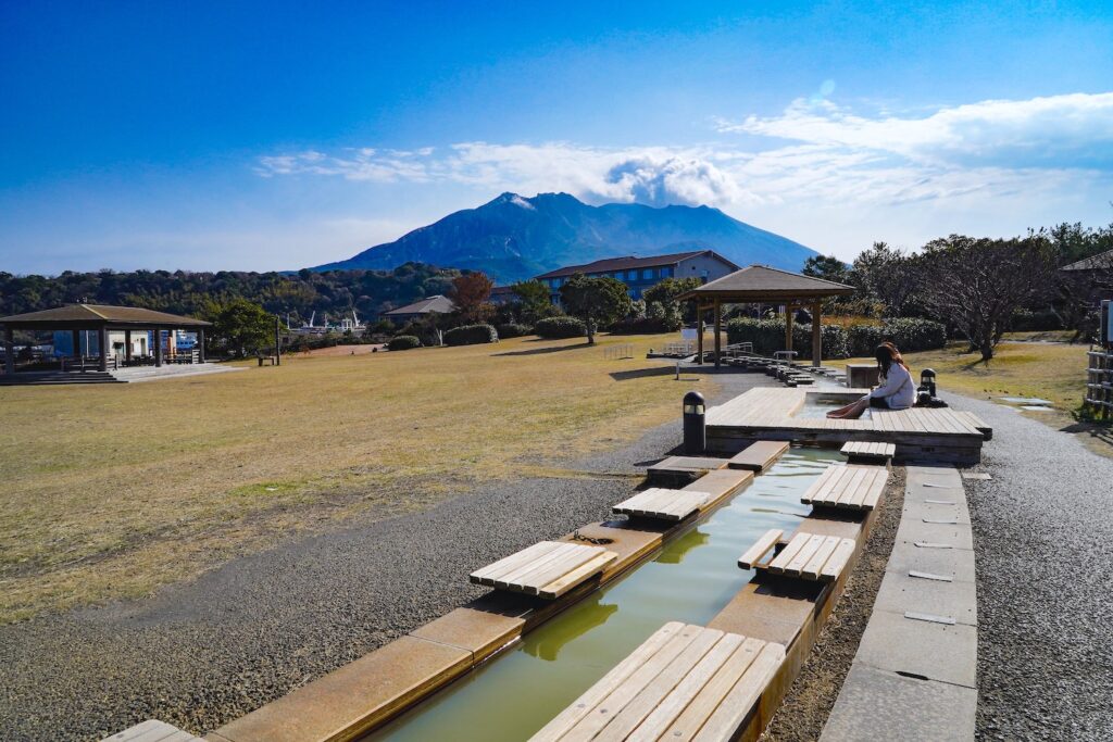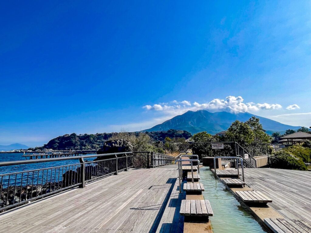 บ่อแช่เท้าออนเซ็นธรรมชาติที่มีความยาว 100 เมตรและมีต้นกำเนิดน้ำออนเซ็นลึกลงไปใต้ภูเขาไฟซากุระจิมะกว่าหนึ่งกิโลเมตร ขณะที่แช่เท้าเมื่อมองออกไปชมวิวรอบๆ เหมือนเราถูกโอบล้อมด้วยทัศนียภาพจากภูเขาไฟซากุระจิมะ และอ่าวกิงโกะ ที่สวยงามมากๆ