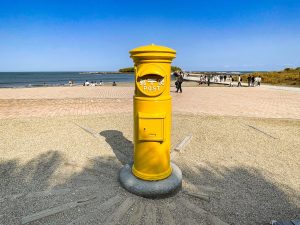 มีศาลเจ้าตั้งอยู่บนเกาะที่เชื่อมด้วยสะพานข้าม ระหว่างทางเข้าศาลเจ้า จะมีหินเรียงกันเป็นเส้นๆ เกิดจากการกัดกร่อนของคลื่นทะเล คนญี่ปุ่นจึงจินตนาการเห็นลายหินเหล่านี้เป็น “Devil’s Washboard” หรือ “กระดานซักผ้ายักษ์” บริเวณหาดยังมีเปลือกหอยขนาดเล็กกระจายอยู่ทั้งหาด สามารถหาเปลือกหอยที่ชอบไปวางไว้ที่ขอพรภายในศาลเจ้าเพื่อเป็นอนุสรณ์ได้ด้วย นอกจากนี้ยังมีรถตุ๊กๆ ที่คุ้นตารับส่งระหว่างหาด และศาลเจ้าด้วยนะ