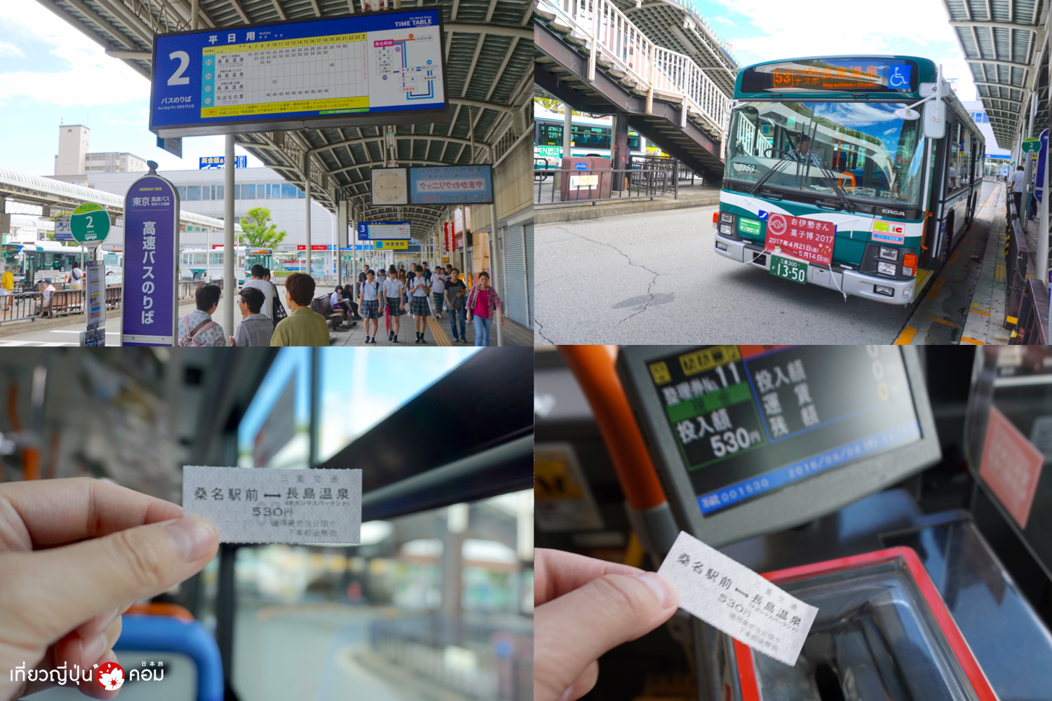 ด้านหน้าสถานีจะเป็นท่ารถบัส ที่เราสามารถขึ้นรถบัสหมายเลข 53 ปลายทางไปลง Nagashima Onsen ได้ ค่าโดยสารคนละ 530 เยน ซื้อได้ที่ตู้อัตโนมัติก่อนขึ้น และขาลงอย่าลืมหย่อนตั๋วคืนให้คนขับที่ช่องทางออกด้วยนะครับ