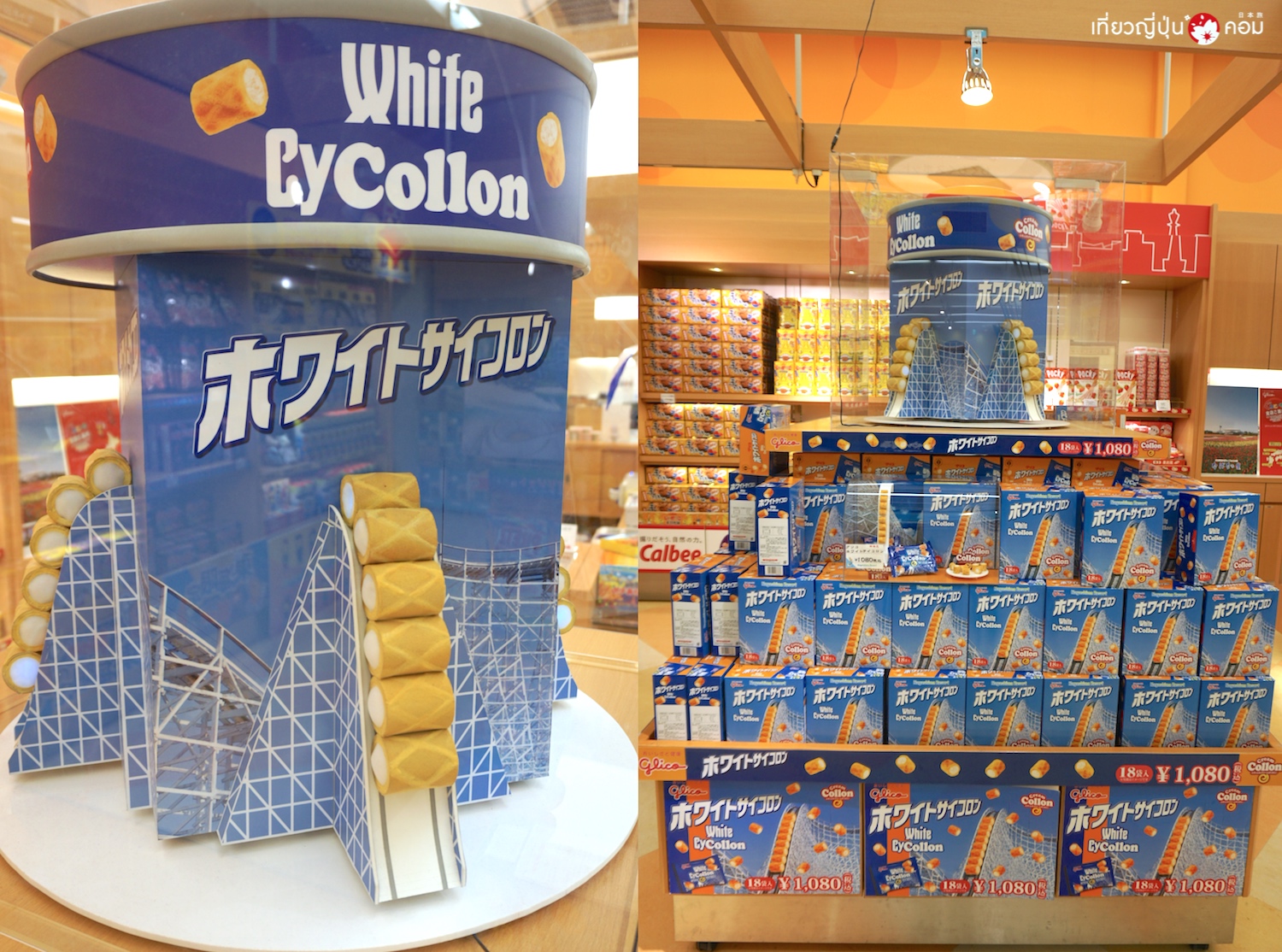 ที่ร้านขายของฝาก มีผลิตภัณฑ์ของกุลิโกะในแพกเกจพิเศษด้วย อย่างอันนี้เป็นโคลลอนแต่ใช้ชื่อว่า White CyCollon ออกแบบมาจากเครื่องเล่น White Cyclone นั่นเอง