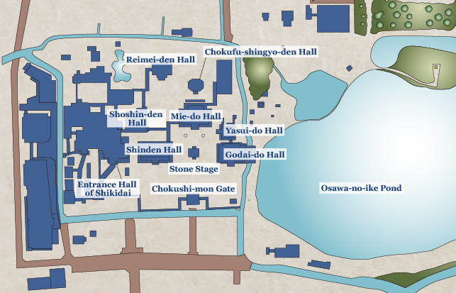 นอกจากนี้ อีกหนึ่งสส่วนที่มีความสำคัญมากก็คือ บ่อน้ำโอซะวะ (Osawa Pond) ที่ขุดขึ้นด้วยแรงงานมนุษย์ และมีอายุเก่าแก่ที่สุดในญี่ปุ่น สร้างขึ้นก่อนที่จะมีวัดไดคะคุจิเสียอีก บ่อน้ำแห่งนี้ใช้ในการสันทนาการมากมาย ไม่ว่าเป็น ล่องเรือ งานสังสรรค์ ตกปลา และกิจกรรมที่เป็นที่โปรดปรานมากที่สุดคือ การชมจันทร์ โดยจักรพพรดิจะไม่เงยหน้าขึ้นไปชมจันทร์ เนื่องจากตำแหน่งจักพรรดินั้นสูงที่สุด ไม่มีสิ่งใดอยู่เหนือได้ การชมจันทร์จึงสามารถทำได้โดยการชมจากเงาสะท้อนที่ตกกระทบกับผิวน้ำเท่านั้น