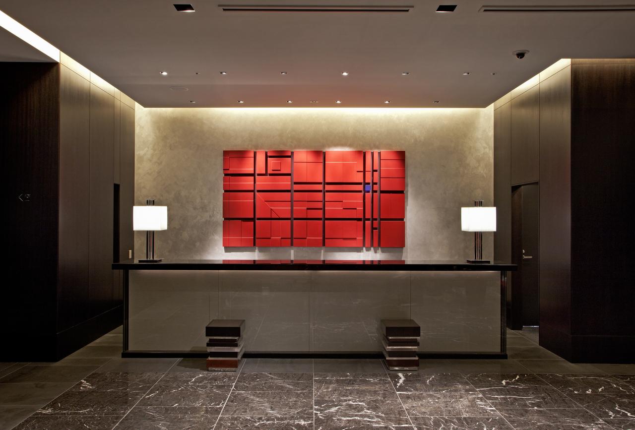 บริเวณลอบบี้ตกแต่งโทนสีเข้ม เน้นแสงและเงา ให้ความรู้สึกพรีเมียม หรูหรา