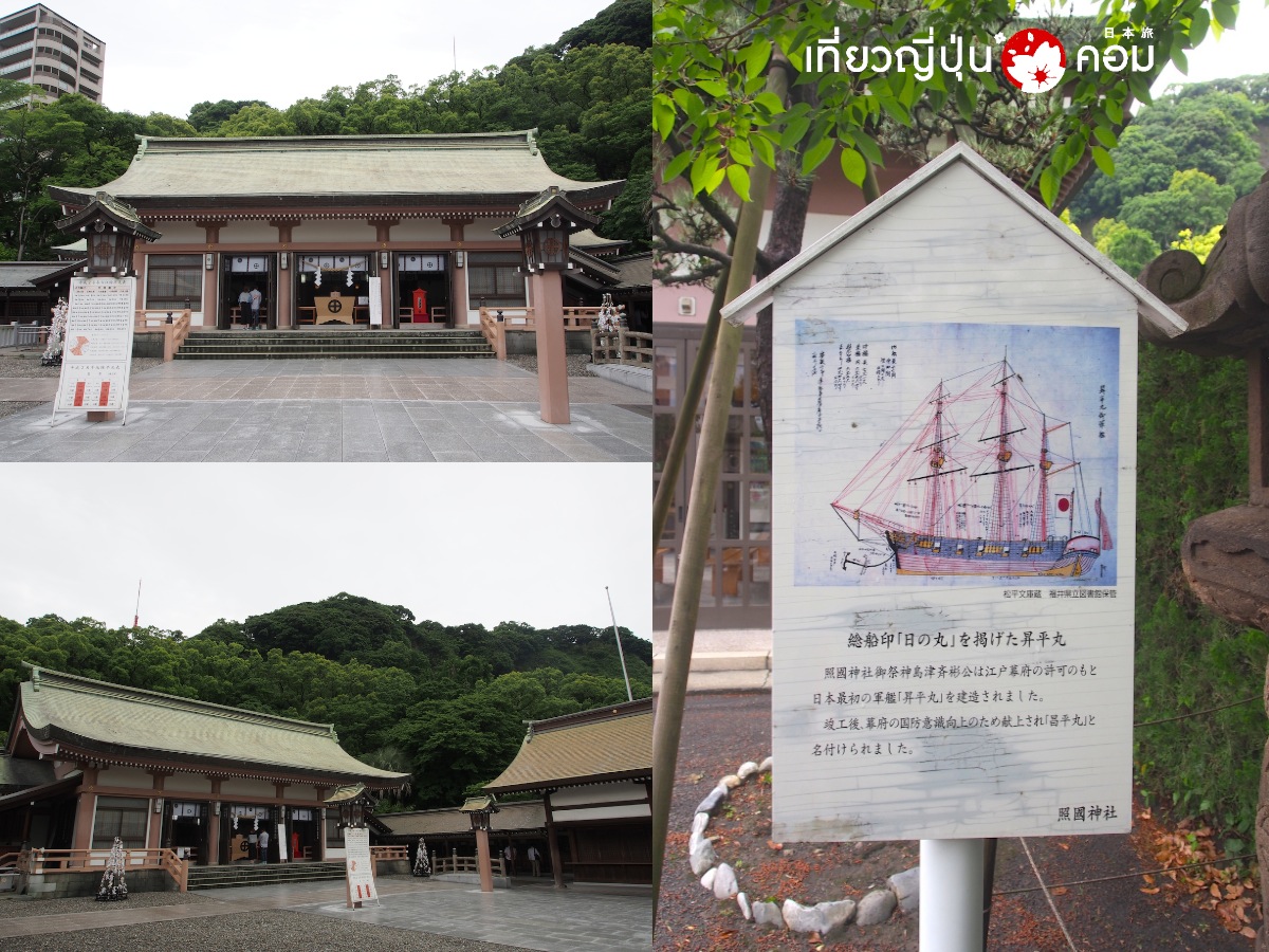 หลังจากอิ่มอร่อยและซื้อของฝากเรียบร้อย เราเดินจากย่านเท็มมงคังไปกันต่อที่ ศาลเจ้า Terukuni เป็นศาลเจ้าในศาสนาชินโต สร้างขึ้นเมื่อปี ค.ศ.1877 ภายในศาลเจ้ายังมีพิพิธภัณฑ์ที่แสดงประวัติความเป็นมาของตระกูลชิมาซุ ซึ่งเป็นไดเมียวปกครองกลุ่มซัตสึมะมาตั้งแต่ยุคคามาคุระ (1185-1333) ภายในจัดแสดงวัตถุต่างๆ ที่สื่อให้เห็นบุคลิกภาพและความสำเร็จของชิมาซุ นาริอาคิระ และยังมีนิทรรศการเกี่ยวกับประวัติศาสตร์ ขนบประเพณีพื้นบ้าน และธรรมชาติของจังหวัดคาโกชิมะ