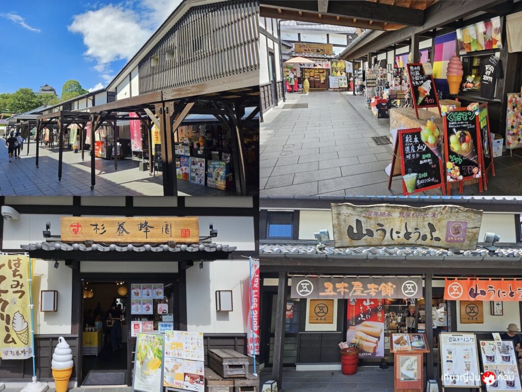 ศูนย์ช้อปปิ้งไม่ไกลกันจากตัวปราสาท ที่ตกแต่งสไตล์ย้อนยุคเป็นเอกลักษณ์ เพื่อให้เข้ากับบรรยากาศเมืองโบราณ จุดเด่นของที่นี่คือร้านค้า 23 ร้าน จำหน่ายสินค้าพื้นเมือง ไม่ว่าจะเป็น ข้าวของเครื่องใช้ ของฝากต่างๆ และพิพิธภัณฑ์ Wakuwaku ที่บอกเล่าความเป็นมาของเมืองนี้ รวมถึงของกินแสนอร่อย แนะนำว่าต้องลองชิมโคร็อกเกะสอดไส้อุนิกันด้วย ถ้าใครชอบซอฟครีม แทบจะทุกร้านที่นี่จะมีขายซอฟครีมรสต่างๆ สูตรใครสูตรมัน มีทั้งแบบโคน ถ้วย พาร์เฟ่ต์ รอบนี้เราแวะกันที่ร้าน Izumicha สั่งซอฟครีมมัทฉะกับชาเขียวกินให้ชื่นใจ