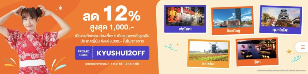 จองกิจกรรมท่องเที่ยวใน 5 เมือง (ฟุกุโอกะ, คิตะคิวชู, คุมาโมโตะ, ซาเซโบะ, ฮิตะ) พร้อมส่วนลด 12% สูงสุด 1,000 บาท เมื่อซื้อครบ 3,000 บาทขึ้นไป ต่อรายการ ได้ทาง KLOOK