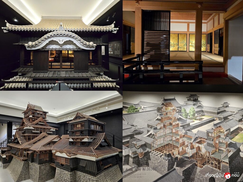 มีประวัติศาสตร์กว่า 400 ปี อาคารหอคอยหลักเทนชุคาคุได้รับการบูรณะในปีค.ศ. 1960 ซึ่งยังคงโครงสร้างสถาปัตยกรรมภายนอกเดั่งในอดีต หอคอยเทนชุคาคุมีความสูงจากฐานกำแพงหินประมาณ 30 เมตร ทั้งหมด 6 ชั้น ซึ่งรวมชั้นใต้ดิน 1ชั้นด้วย นับว่าหาได้ยากในญี่ปุ่น เคยถูกใช้เป็นที่พักของขุนนางตระกูลคะโตและตระกูลโฮโซคาวะ ปัจจุบันนี้ได้เป็นที่จัดแสดงนิทรรศการและข้าวของเครื่องใช้ทางประวัติศาสตร์ในสมัยนั้น
