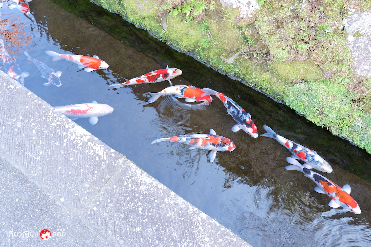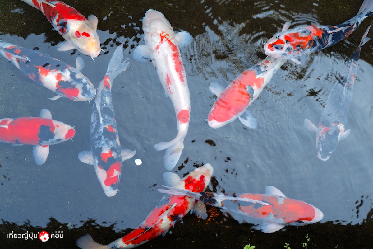 ปลาคาร์ฟตัวใหญ่ว่ายกันไปมาตามร่องน้ำ