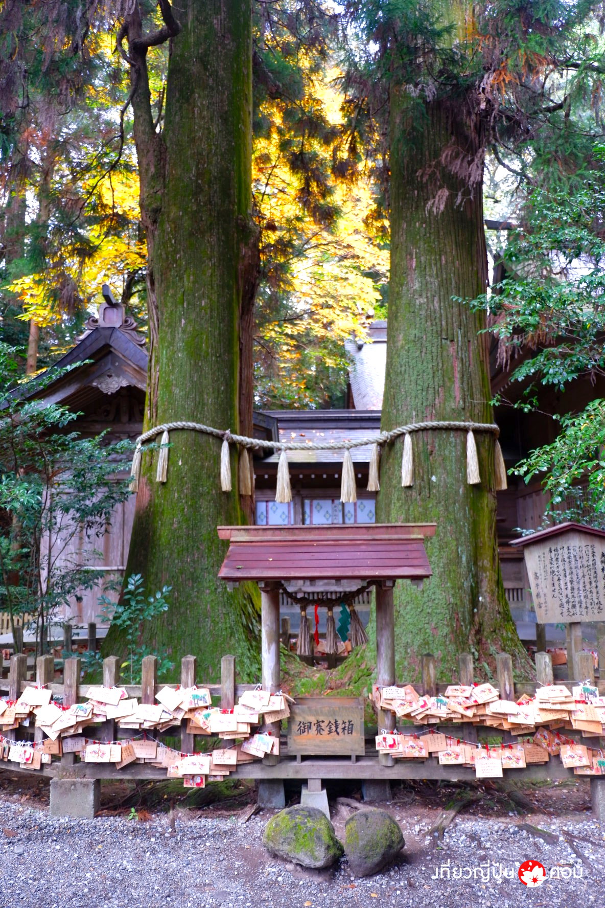 ภายในศาลเจ้ายังมีความพิเศษของต้นสนทั้งสองยืนต้นยืนเคียงคู่กัน เชื่อกันว่าหากใครพาคู่ของตัวเองมาเดินจูงมือวนรอบต้นสนสามรอบจะได้เป็นเนื้อคู่กัน