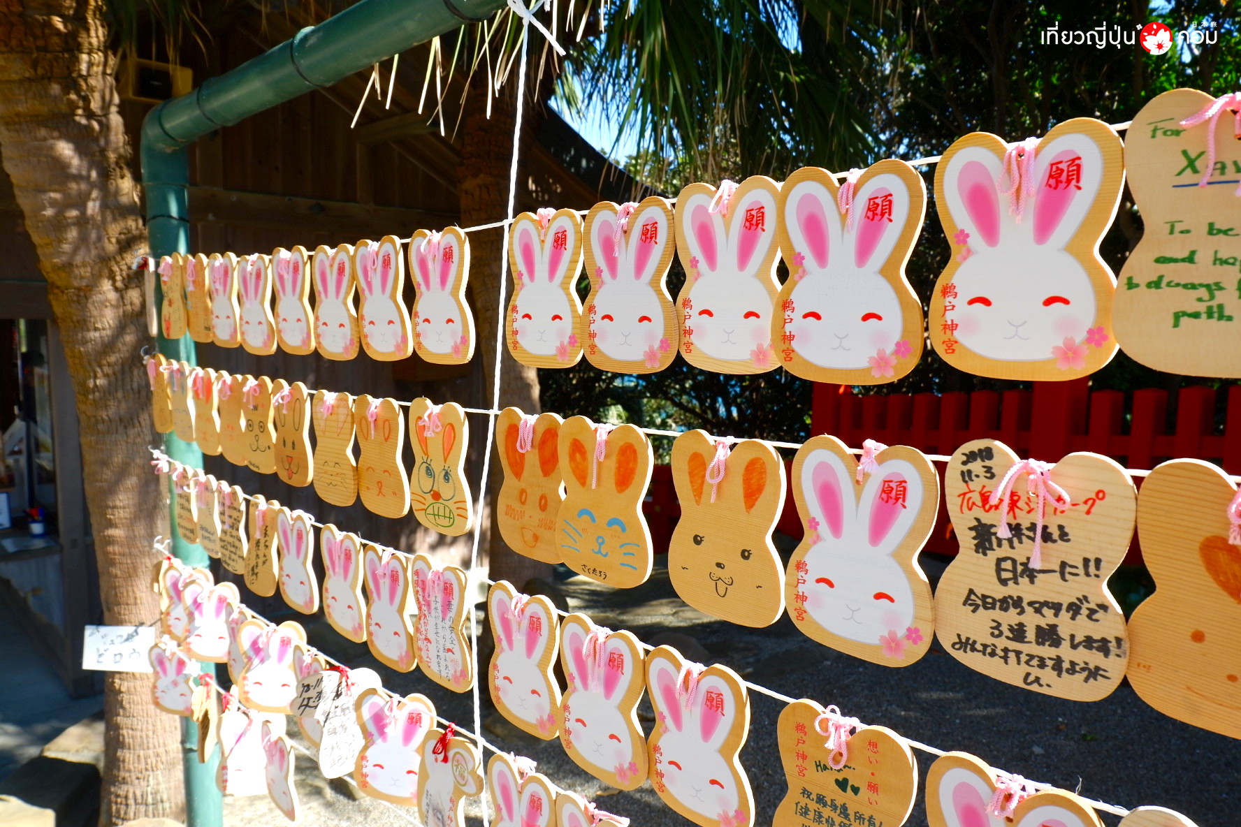 แผ่นขอพรรูปกระต่าย ที่ศาลเจ้าแห่งนี้มีความเชื่อกันว่ากระต่ายนั้นเป็นสัตว์ที่จะนำพาคำขอของผู้ที่อธิษฐานไปยังเทพเจ้า