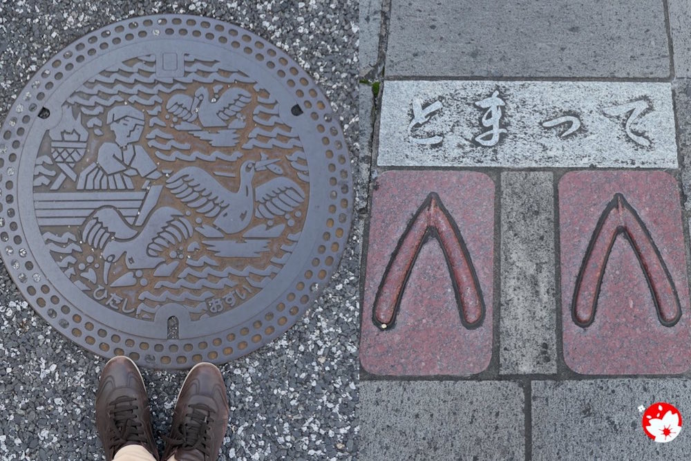 ฝาท่อประจำเมืองฮิตะ และป้ายบอกให้หยุดที่พื้น ทำเป็นลายเกี๊ยะ น่ารักดี