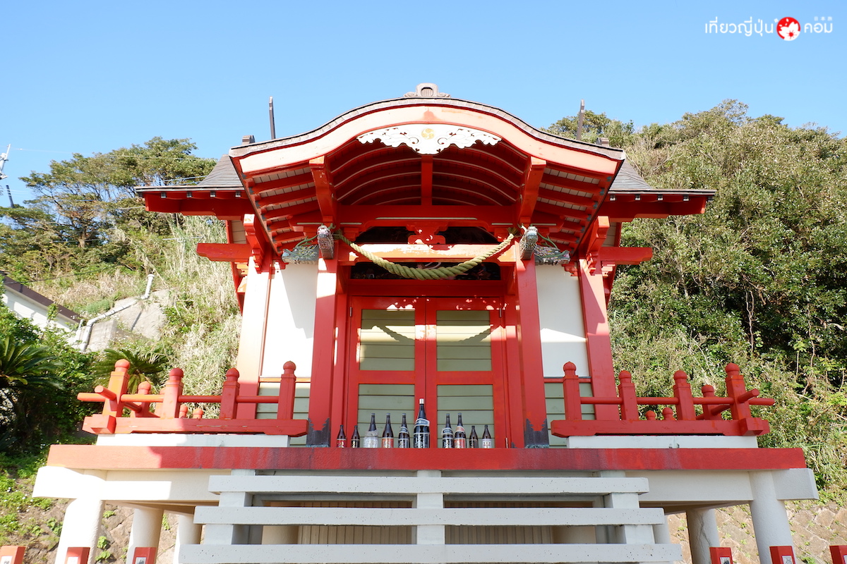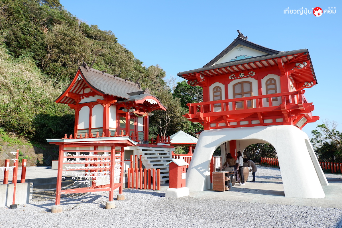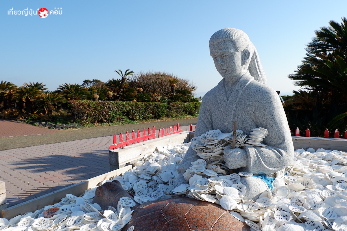 จากนั้นเดินทางสู่เมืองอิบุซึกิ สักการะ ศาลเจ้าริวงู (Ryugu shrine) สีแดงสดริมทะเล ตั้งอยู่บริเวณจุดใต้สุดของคาบสมุทรซัทสึมะ สร้างขึ้นเพื่อบูชาเทพเจ้าโทโยทามะฮิเมะ (โอโตเมะฮิเมะ) ผู้ปกปักษ์รักษาท้องทะเล อีกทั้งศาลเจ้าแห่งนี้ยังมีตำนานนิทานญี่ปุ่นชื่อดังของอุระชิมะทาโร่กับโอโตเมะฮิเมะ ศาลเจ้านี้มีชื่อเสียงในเรื่องของความรัก โดยการอธิฐานจะมีเปลือกหอยในหม้อขนาดใหญ่ ให้เขียนความปรารถนา ลงบนเปลือกหอย แล้วอธิษฐานขอให้ความรักสมหวัง