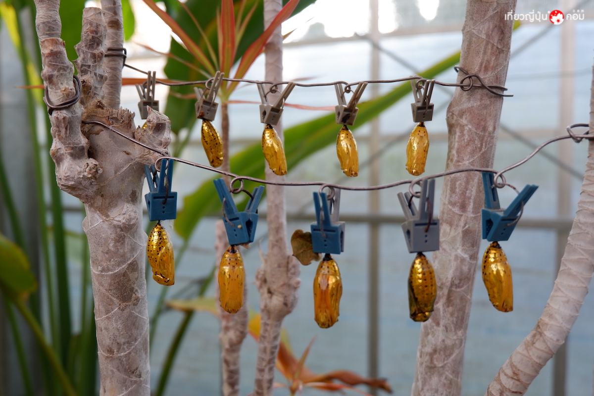 อีกทั้งยังมีห้องเรือนกระจกใช้เพาะพันธุ์ผีเสื้อ ให้เข้าชมได้อย่างใกล้ชิด ในภาพคือดักแด้ตัวอ่อนที่กำลังจะกลายเป็นผีเสื้อ
